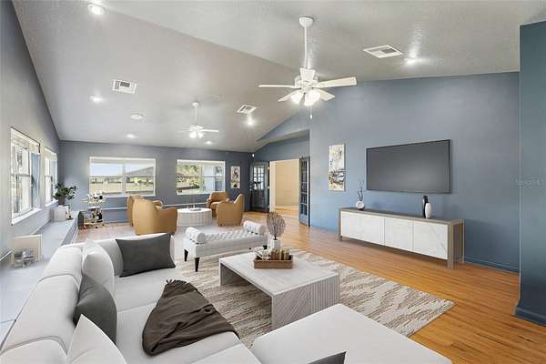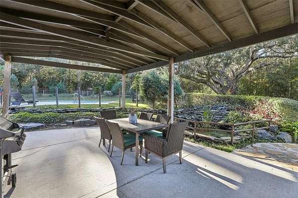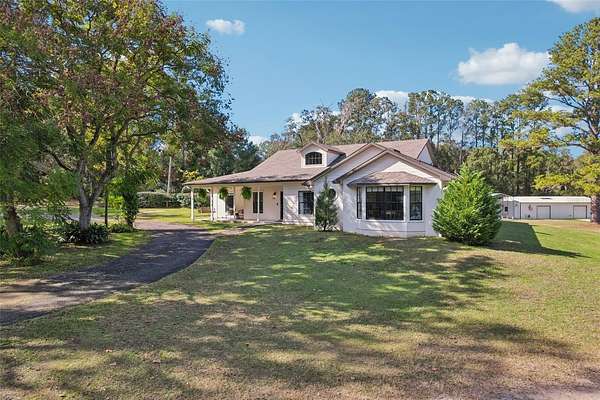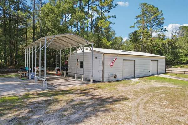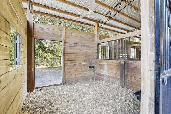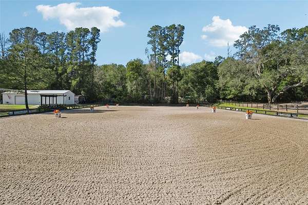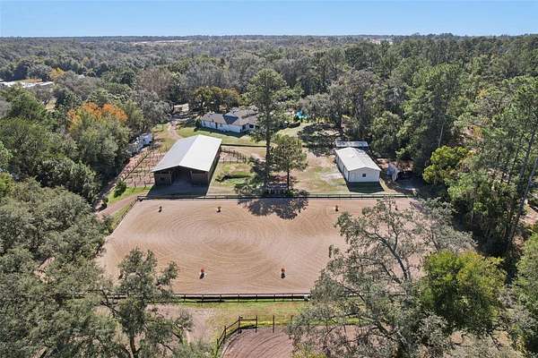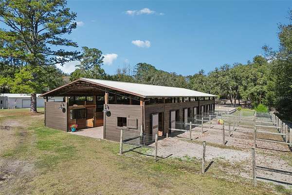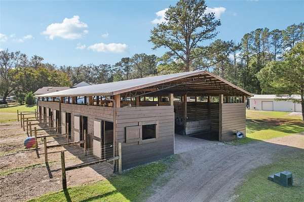 One or more photo(s) has been virtually staged. An exceptional private equestrian estate--where refined country luxury meets world-class performance facilities--just one hour from the renowned World Equestrian Center. Set on nearly five fenced acres, this rare offering is ideal for international buyers, professional trainers, or discerning equestrians seeking a turnkey Florida training base with privacy, infrastructure, and effortless livability. The custom 5-bedroom, 4-bath residence, including a private in-law suite. A spacious open floor plan showcases beautifully stained concrete floors throughout. The kitchen features stainless steel appliances, an eat-in dining area, expansive walk-in pantry, additional walk-in storage, and new LG stainless dishwasher, sink, and fixture installed in 2025. The kitchen flows seamlessly into the great room, anchored by a gas fireplace ideal for entertaining or everyday living. An expansive recreation/media room offers built-in bench storage, extensive electrical access, and a private exterior entrance leading directly to the resort-style pool--ideal for entertaining, staff use, or multi-generational living. The primary suite is a serene retreat with a spa-inspired bath, soaking tub, walk-in shower, and spacious walk-in closet. A thoughtfully designed mud and utility room with separate exterior entrance allows seamless transition from barn to home. The interior in-law suite offers full independence with a private entrance, kitchenette, living area, bedroom, and handicap-accessible bath. Equestrian facilities rival professional training centers. The 3,500-sq-ft main barn features eight stalls with electric and fenced runouts, with infrastructure in place to expand to ten. Each stall includes gossip rail doors, automatic waterers, and ceiling fans. A pavered center aisle is enhanced by oversized fans and double wash racks with hot and cold water. The lockable, climate-controlled tack room includes laminate flooring, eight bay tack closets, kitchenette, bathroom, washer/dryer hookup, and a see-through window overlooking the barn aisleway. The property offers five fully electric paddocks, including one with a two-stall additional barn. The 100' x 200' covered arena is laser-leveled with premium fiber mesh footing and a custom viewing area, highly regarded by professional trainers. Supporting infrastructure includes a 1,200-sq-ft workshop with double carport, a 14x30 camper carport on a 30x30 concrete pad with 30- and 50-amp service, plus additional 30-amp service at the front of the property--all with water access. There is ample room for trailers, equipment, and guest parking, and the home benefits from a fully irrigated landscape. Outdoor living is resort-inspired with a pool, expansive decking, covered pergola, and tranquil stream, waterfall, and fish pond framed by rock-wall landscaping. A side yard fire pit and tree swing complete this private retreat. Gated and fully enclosed with no-climb fencing, this refined equestrian estate presents a rare opportunity to own a professionally equipped Florida horse property--just one hour from the World Equestrian Center and minutes to major roads and shopping--perfect for international competition, seasonal residency, or long-term investment.