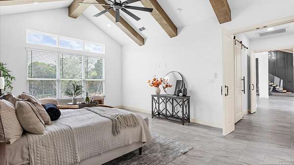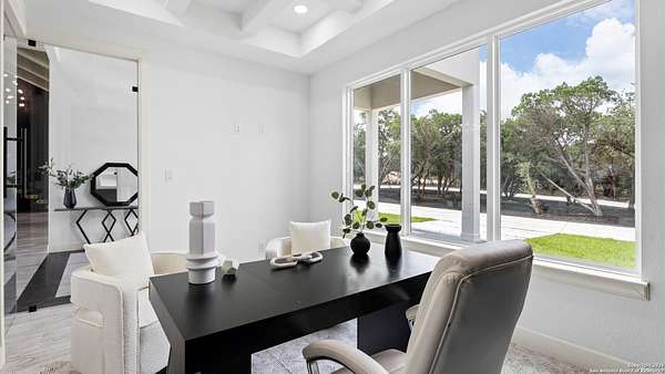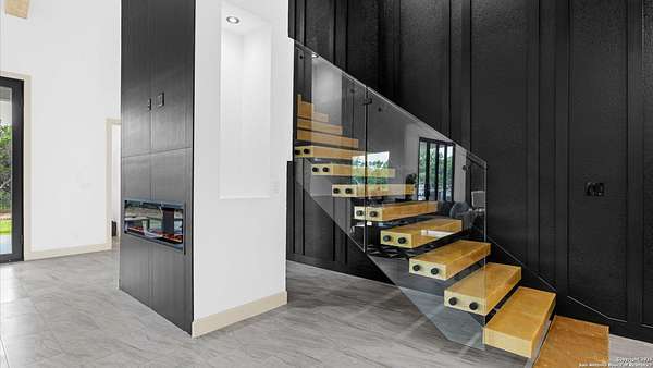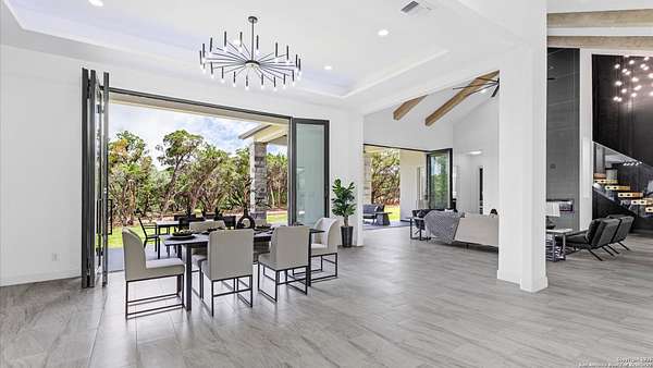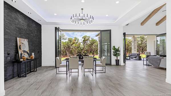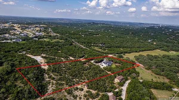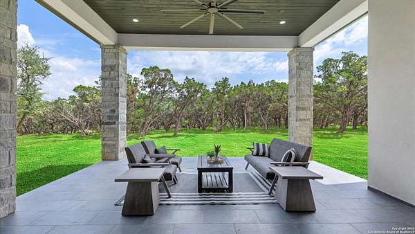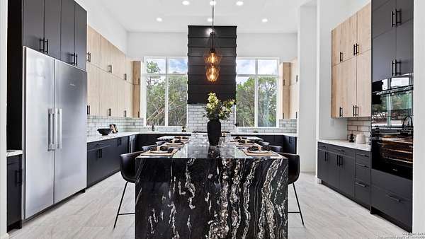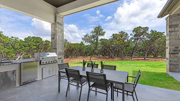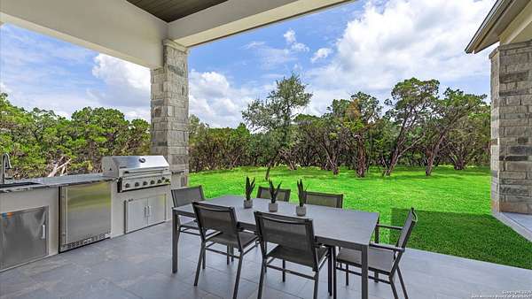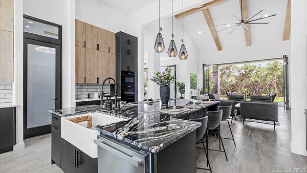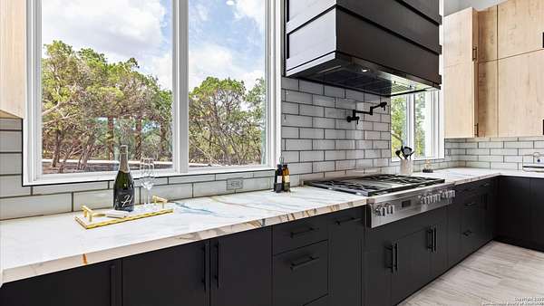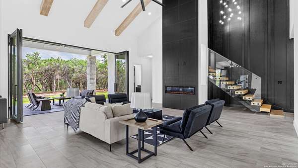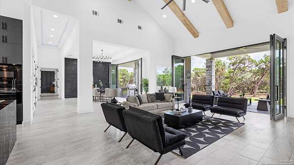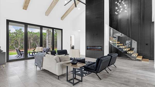 Grand entry and chef's kitchen set the tone in this newly constructed architectural estate on 5 private acres along Scenic Loop-offering Hill Country privacy just minutes from premier shopping and dining. A circular drive leads to an oversized three-car side-entry garage. Custom 9-ft glass doors open to soaring interiors with 20-ft ceilings, exposed beams, cove lighting, and a dramatic floor-to-ceiling fireplace black tile fireplace with a floating staircase. The chef's kitchen features Miele luxury appliances, granite countertops, custom cabinetry, a large island, built-in 55-inch double-door refrigerator, ice maker, and commercial-grade six-burner gas cooktop. The private owner's retreat offers a spa-inspired bath with an oversized glass-enclosed shower and a generous walk-in closet with stackable washer/dryer. Expansive folding glass doors open to two covered patios and a custom outdoor kitchen, creating seamless indoor-outdoor living. A secondary bedroom with en-suite bath is on the main level. Upstairs includes a game room with bar, plus two additional bedrooms and a guest bath. Horses welcome. A rare opportunity for new construction on acreage in a prime location.
