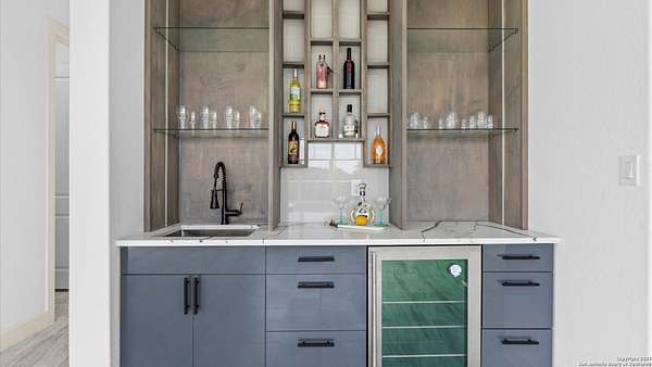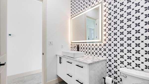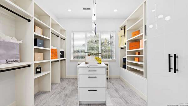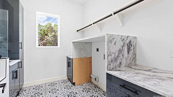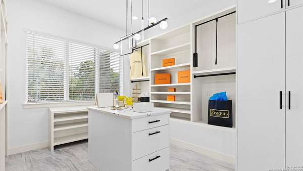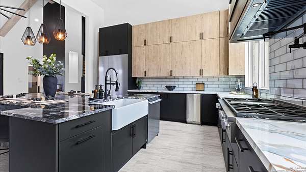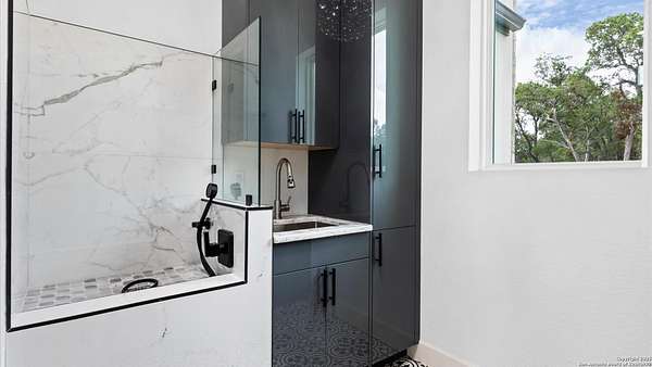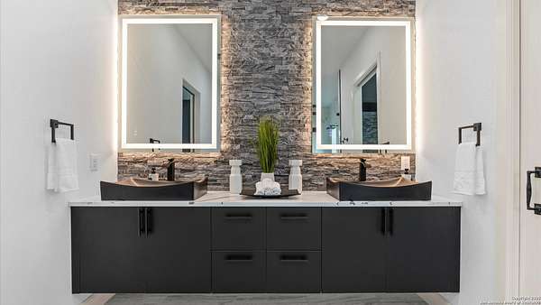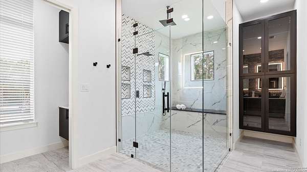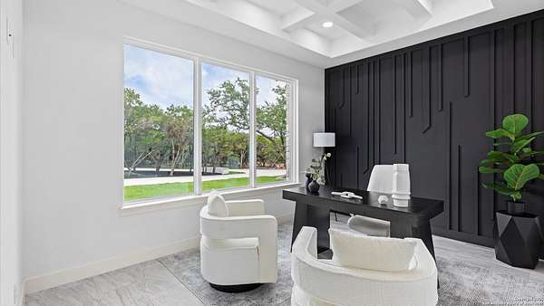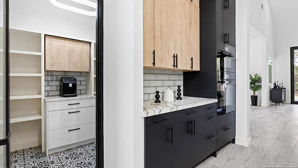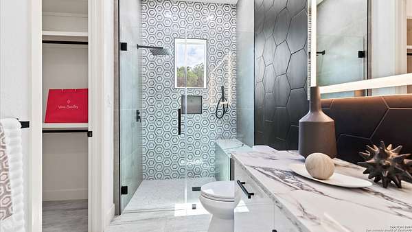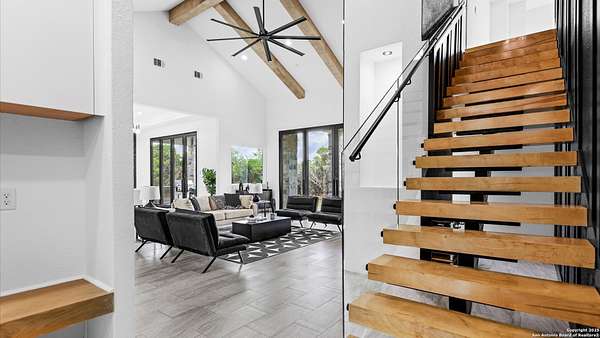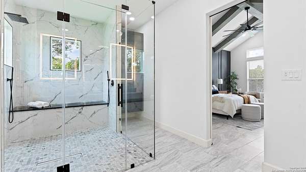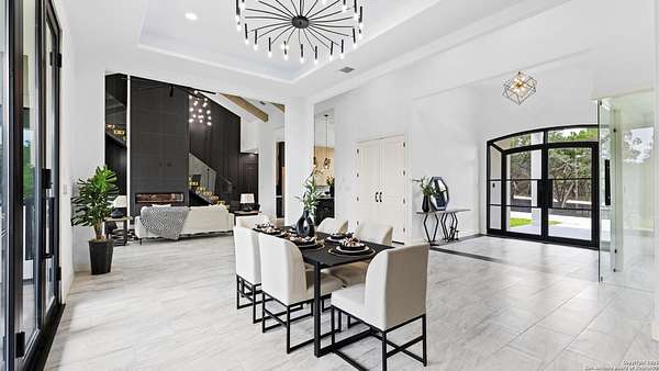 Grand entry and chef's kitchen set the tone in this newly constructed architectural estate on 5 private acres along Scenic Loop-offering Hill Country privacy just minutes from premier shopping and dining. A circular drive leads to an oversized three-car side-entry garage. Custom 9-ft glass doors open to soaring interiors with 20-ft ceilings, exposed beams, cove lighting, and a dramatic floor-to-ceiling fireplace black tile fireplace with a floating staircase. The chef's kitchen features Miele luxury appliances, granite countertops, custom cabinetry, a large island, built-in 55-inch double-door refrigerator, ice maker, and commercial-grade six-burner gas cooktop. The private owner's retreat offers a spa-inspired bath with an oversized glass-enclosed shower and a generous walk-in closet with stackable washer/dryer. Expansive folding glass doors open to two covered patios and a custom outdoor kitchen, creating seamless indoor-outdoor living. A secondary bedroom with en-suite bath is on the main level. Upstairs includes a game room with bar, plus two additional bedrooms and a guest bath. Horses welcome. A rare opportunity for new construction on acreage in a prime location.