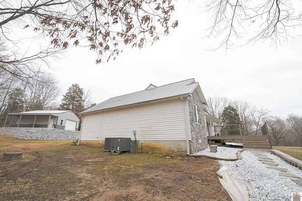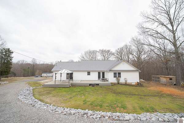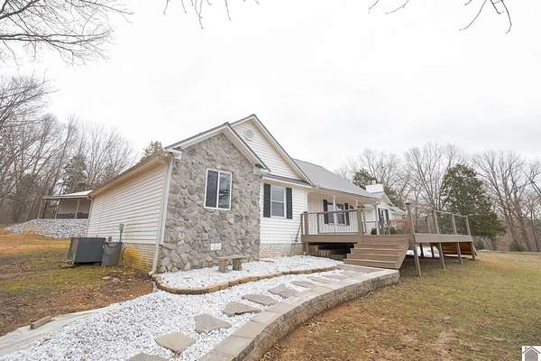 Privacy. Freedom. Possibility. All just minutes from Kentucky Lake. This inviting 3 bed, 2 bath home sits on 12+ breathtaking acres designed for the way you want to live. Ride your own ATV trails, explore two peaceful creeks, hunt from the tree stand already in place, or build a second home on the cleared site. Mornings start on the newly added front deck surrounded by nothing but nature. Inside, you'll appreciate the updates: new windows (2024), new front door and French doors, fresh paint, updated fixtures, and added can lighting for a bright, refreshed feel. The land truly sets this property apart with two wells (home and livestock), a 30x30 pull-through pole barn, 2-car carport, chick coop, and an insulated she-shed with heat and air perfect for a home office or studio. An additional lot includes a 25x30 garage with separate utilities and septic. The property completes itself with three driveway access points, offering flexibility and future potential.