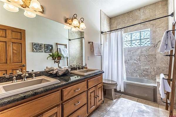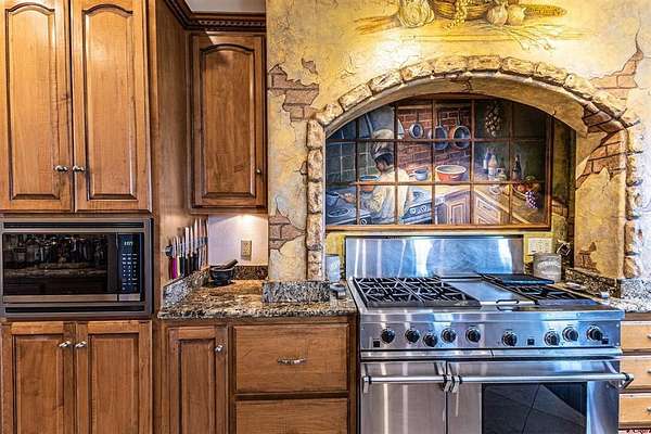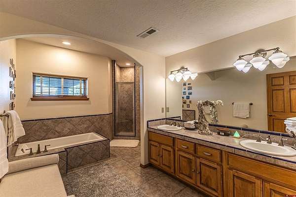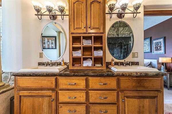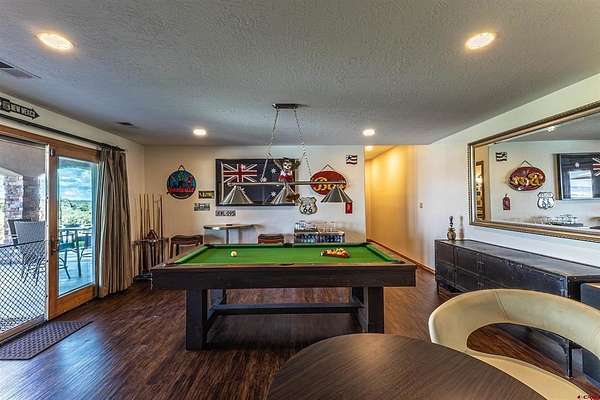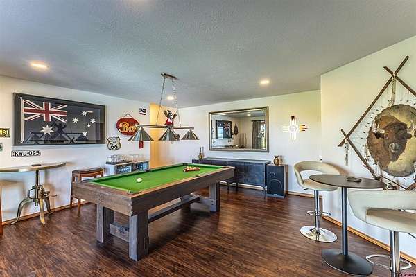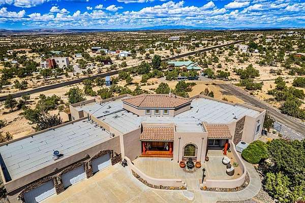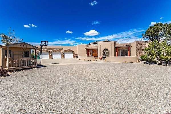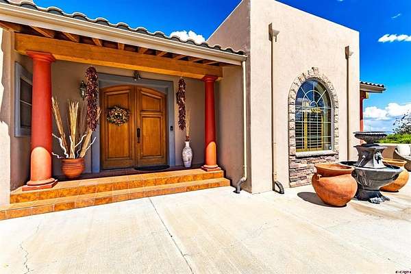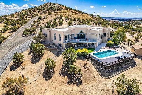 Allen Elmore, eXp Realty, LLC, C: 505-686-3831, Allen@AE.Properties, www.crenmls.com: ''Lion's Share'' Exquisite Spanish-style estate on 2.5-acre hillside in N. Farmington w/ 270? panoramic views of the La Plata Mtns, Lukachukai Mtns, Chokecherry Canyon, Barker Dome & more. Less than 1 hr from Durango, this residence blends elegance, serenity & grandeur and features a heated saltwater pool. Grand entry w/ chandelier & soaring ceilings opens to a sunken den boasting 20' ceilings, carved stone gas-log FP mantle & dbl-door balcony access. Formal LR offers 180? views, FP & balcony. Chef's kitchen is a showpiece--marble & tile finishes, pro Jenn-Air 6-burner gas range w/ griddle & dbl oven, new SS fridge/freezer, dishwasher, microwave & trash compactor. Island w/ breakfast bar, wine/coffee bar & pantry-style cabinetry complete the space. Formal DR shines w/ chandelier & mountain vistas. Split floorplan gives the Primary Suite a spa-like retreat--private balcony, gas FP, oversized custom closet, power privacy screen, & en suite bath w/ dual sinks, make-up desk, 2-person tiled shower & jetted soaking tub framed by columns & views. Secondary BRs are spacious--one w/ French door courtyard access. Guest bath w/ dual sinks & tiled tub. Huge laundry rm w/ counters, cabinets & sink. Guest 1/2 bath. Oversized finished 3-car garage w/ storage rooms, shelving & workbench. Downstairs offers 2 add'l oversized BRs (1 w/ dual closets), full bath w/ tiled shower & soaking tub, plus a billiard rm w/ French doors to covered patio & resort-style heated saltwater sports pool and sun deck. Outdoors: new landscaping & driveway, shaded by mature trees & natural juniper, manicured lawn, trails, 2 lg wooden sheds, fenced yard, dog/chicken run, tractor/trailer access & rm to build a shop. Features: central vac, water softener, HVAC system, multiple gas-log FPs, balconies, high ceilings & mountain views from nearly every rm. This is more than a home--it's a private hillside retreat where every sunrise & sunset paints the sky across your personal mountain panorama.