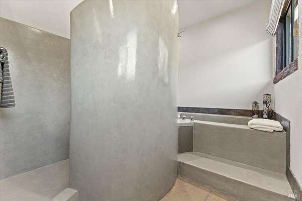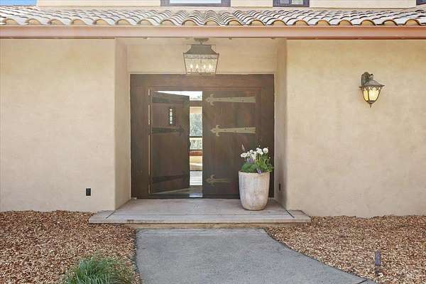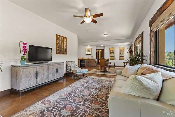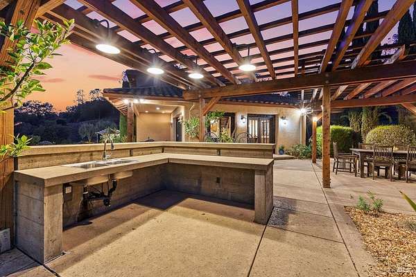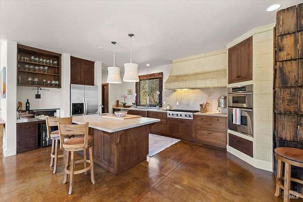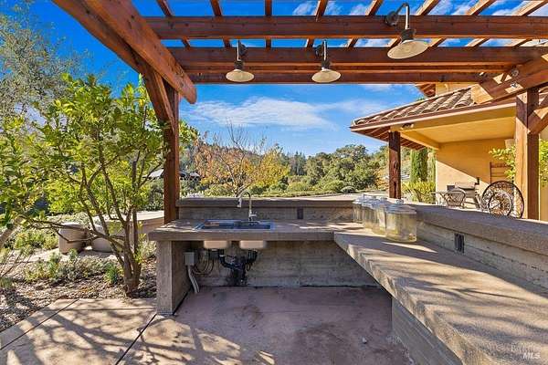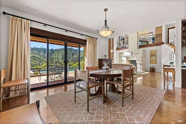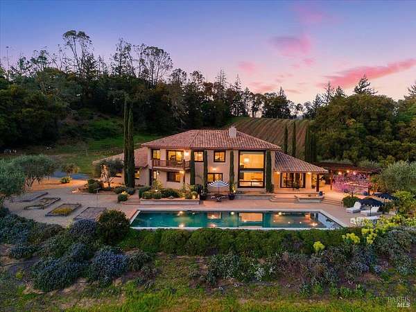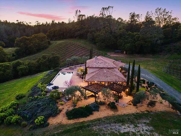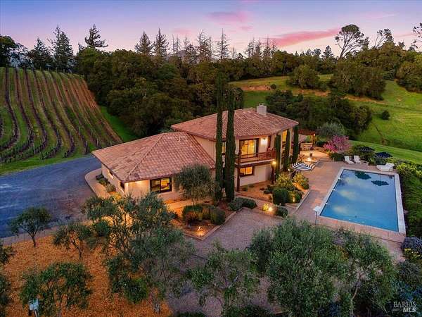 Nestled on 40 acres in the heart of Alexander Valley, this Wine Country Estate combines vineyard elegance with private serenity. Six acres of Cabernet vines frame the property, while heirloom-style hewn woodwork and stained concrete floors set a timeless, artisanal tone. The living room centers on a commanding two-story fireplace and floor-to-ceiling windows that overlook the 60-foot Pebble Tec pool and sweeping hillside-delivering dramatic, ever-changing views. On the main level, you'll find an inviting entertaining room with a bar, two bedrooms and two baths, a gourmet kitchen with soapstone countertops, stainless appliances, and a Viking range, plus a pantry and a generous dining area. The upper level is home to the primary suite with an ensuite spa-like bath and a private office/sitting area. French doors open to an entertainer's outdoor experience where you can dine and sip wine beneath a star filled sky. Outside, olive and fruit trees, raised garden beds, and a chicken niche complete this rural oasis, privately positioned behind the Marietta Winery for ample seclusion. Just minutes from Highway 101, the quaint town of Geyserville, and the chic destination of Healdsburg.
