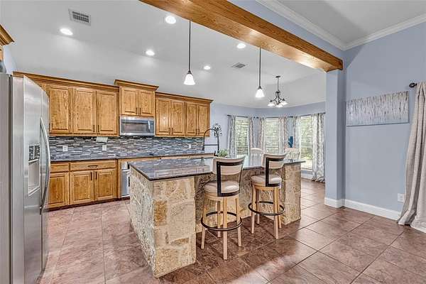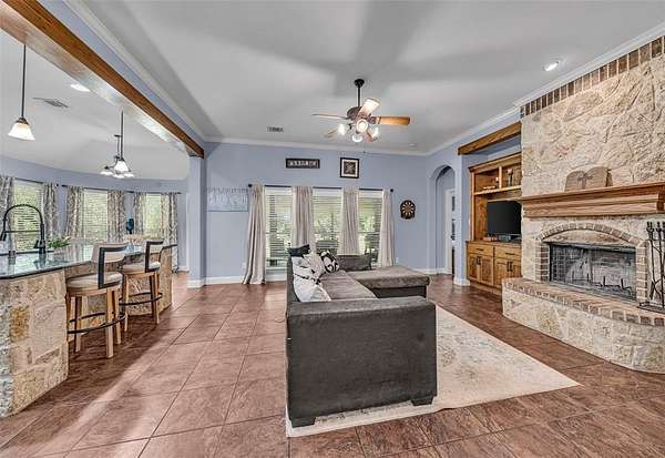The open-concept floor plan features a warm and inviting living area with a stone fireplace, wood-beam accents, and custom built-ins. The spacious kitchen is a true centerpiece, boasting granite countertops, stainless steel appliances, a large island with stone detail, and rich wood cabinetry. A butler's pantry leads into the elegant formal dining room, creating a seamless space for entertaining.
