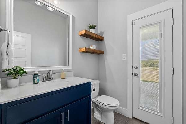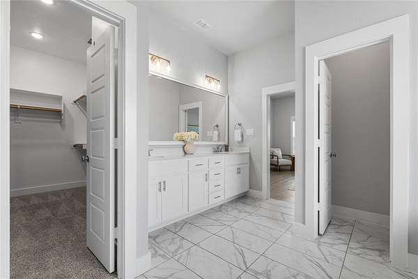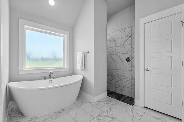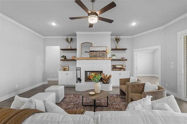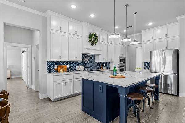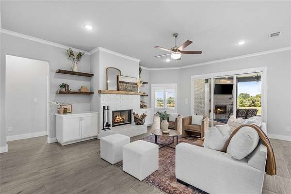 When it's time to unwind, retreat to your secluded primary suite, complete with a free-standing tub, separate shower, dual vanities, and a spacious walk-in closet. Evenings are best spent on the covered back patio, where the outdoor stone fireplace and glowing trim lights set the perfect backdrop for sunsets and starry nights.