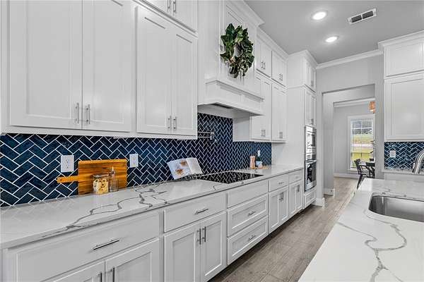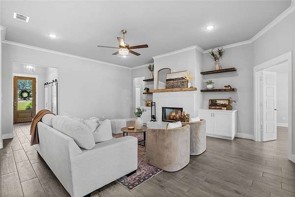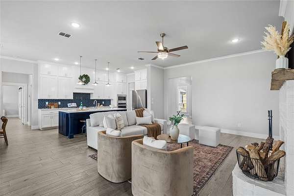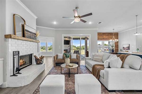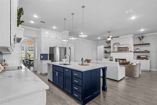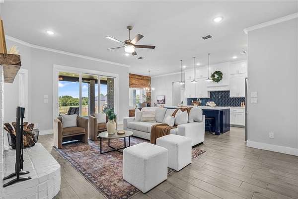 Step inside and feel instantly at home. Warm wood-look tile floors flow throughout the main living areas, while natural wood accents and a stone fireplace create a cozy, inviting atmosphere. The open-concept kitchen is a dream for gatherings with floor-to-ceiling cabinets, a large island, and a formal dining area ready for family dinners or weekend brunches.