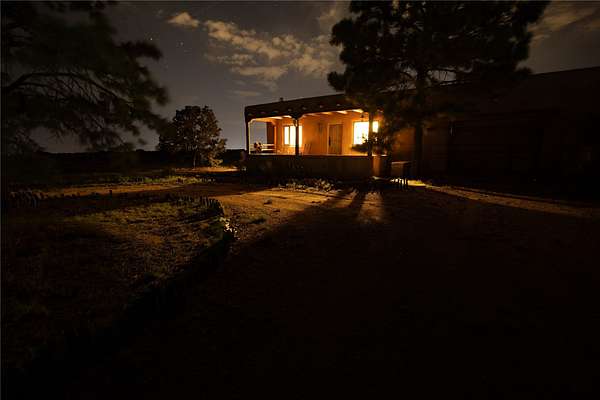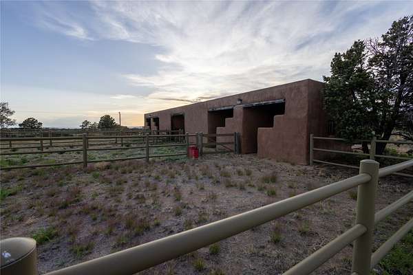 From Old Las Vegas Hwy, take Timberwick Road over I-25 and turn left onto Nine Mile Road. Property on Left almost at the end of the road. Locked Gate. As you proceed down the driveway, to your left are the stalls/corrals, to your right is the Guest House/Casita and ahead is the Main House.
