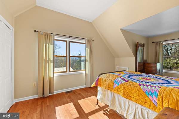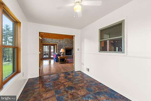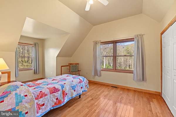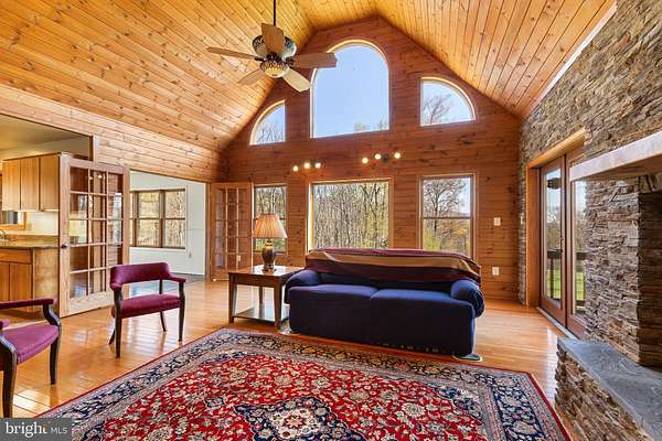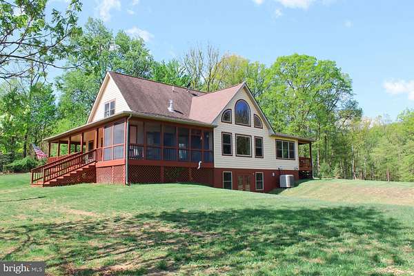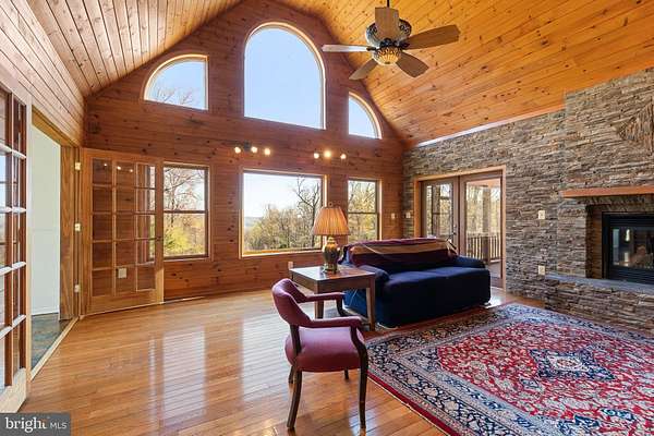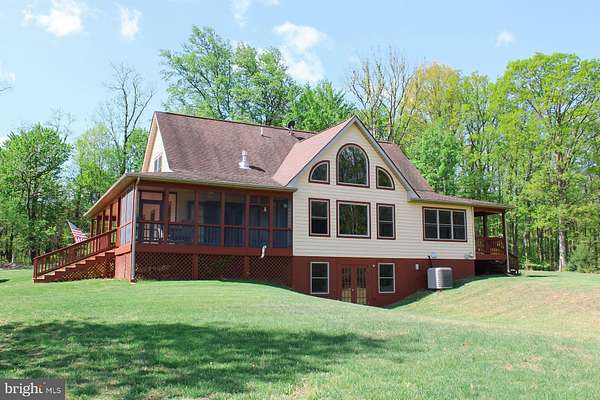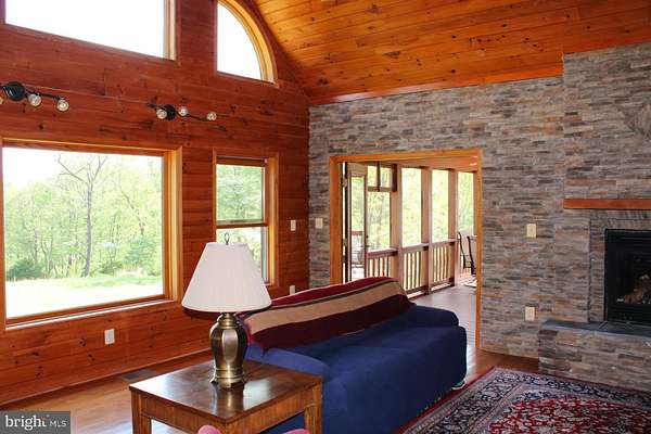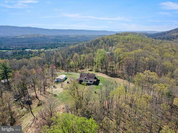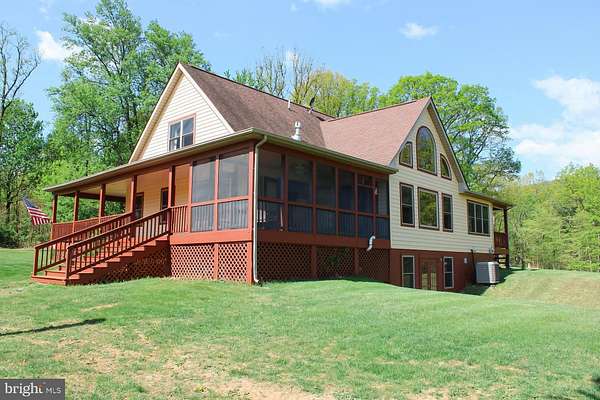 Escape to your own private 16-acre retreat, where the sights and sounds of nature surround you. Relax in total serenity from the expansive wraparound and screened porches, all while taking in breathtaking mountain ridge and valley views. This charming custom built wood-sided Country Cape welcomes you with warm hardwood floors and vaulted ceilings. A dramatic wall of windows fills the great room with natural light and frames the stunning views, complemented by a stacked-stone gas fireplace. The open layout flows into a heated sunroom and a beautifully appointed kitchen featuring a large center island with seating, gas cooktop, granite countertops, built-in double ovens, prep sink and stainless steel refrigerator-perfect for entertaining. A cozy dining area sits just off the kitchen. Convenient one-level living includes a spacious primary suite with a walk-in closet and a full bath featuring a tiled shower and stacked washer/dryer. An adjoining bonus room-ideal as a TV room or office-opens through French doors to the screened porch, a perfect spot for a future hot tub. Upstairs, an open loft overlooks the great room and captures even more of the scenic views, along with two generously sized bedrooms and a full bath. The lower level is ready to become whatever you envision-media room, guest space, or recreation area-with convenient walkout access to the backyard. It also includes a full bath with jacuzzi tub, additional laundry area and utility room. Outdoors, the property invites exploration, with wooded acreage, open space for gardens or animals, and a mountain stream. A detached three-bay garage adds versatility for hobbies or storage, while the outdoor wood furnace keeps the home cozy year-round. All this, just 15 minutes from I-81, offering both privacy and accessibility-a true escape without sacrificing convenience.