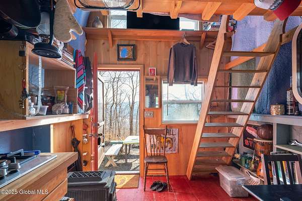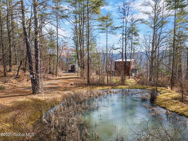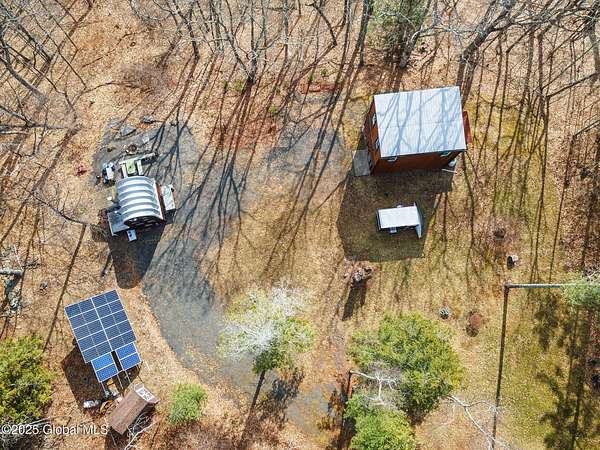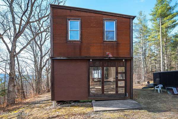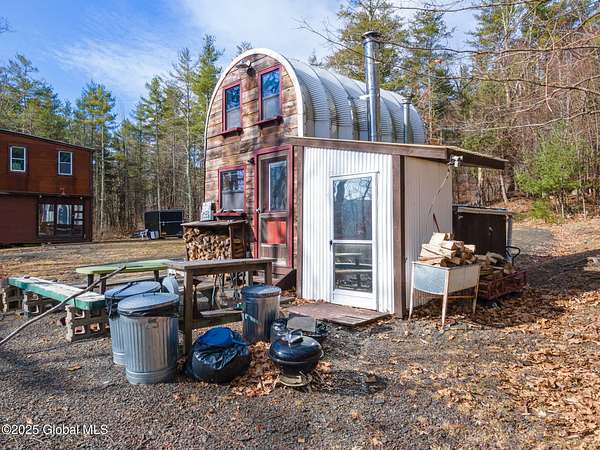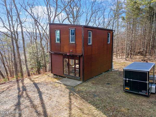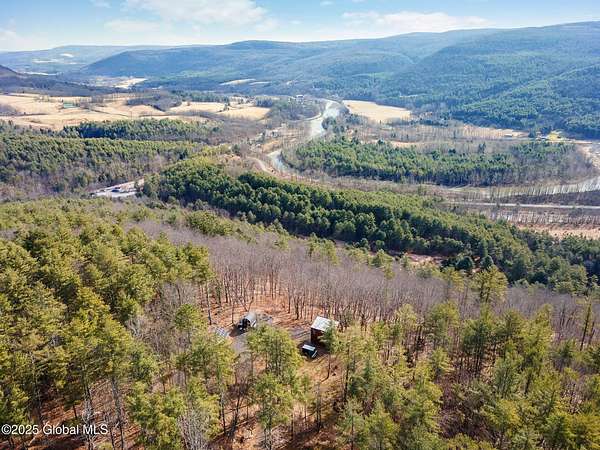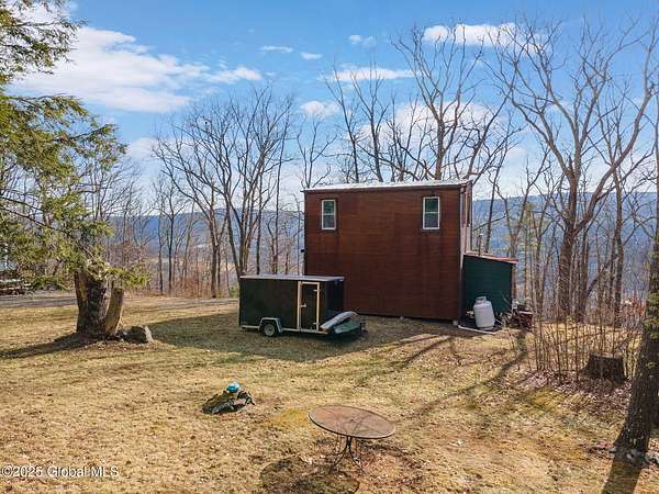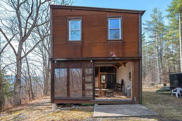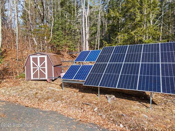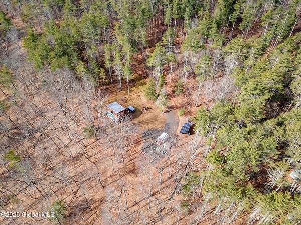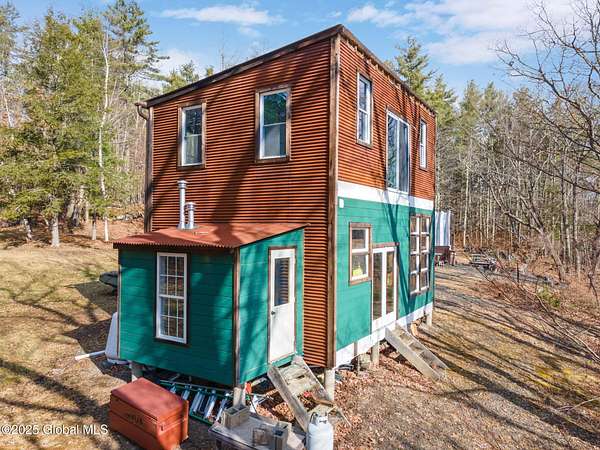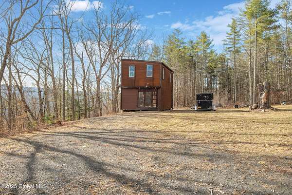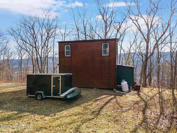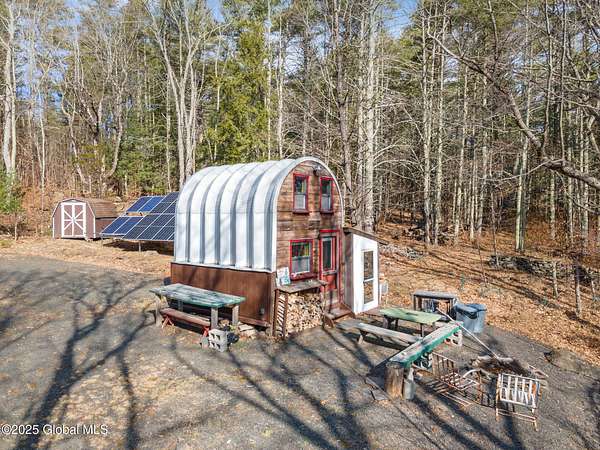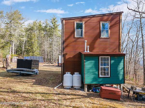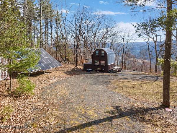 One-of-a-kind property; situated on 13.46 acres with a pond! The main house includes one bedroom with valley views, walk-in closet,1 br, full kitchen, and living area. This home boasts natural light & an open floor plan, w/ a 10-foot sliding door off the living room that beautifully connects the indoor living to outside. Additionally, the laundry/utility room includes LG washer/dryer, tankless hot water system and propane hot air furnace. The second home features a sitting area, mini-fridge and gas stove, butcher block counter, and queen bed loft, and heated by a wood stove and propane wall unit. Both homes are powered by solar energy and the water source is a drilled well. No septic, or perc. Cash or Conventional w/ Bank Of Richmondville. Home located on one mile private road.