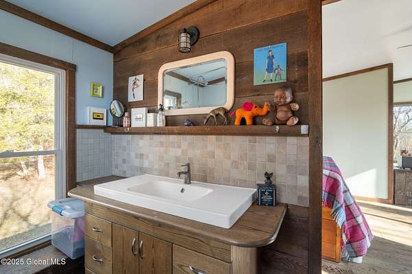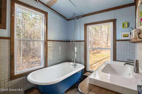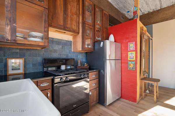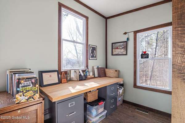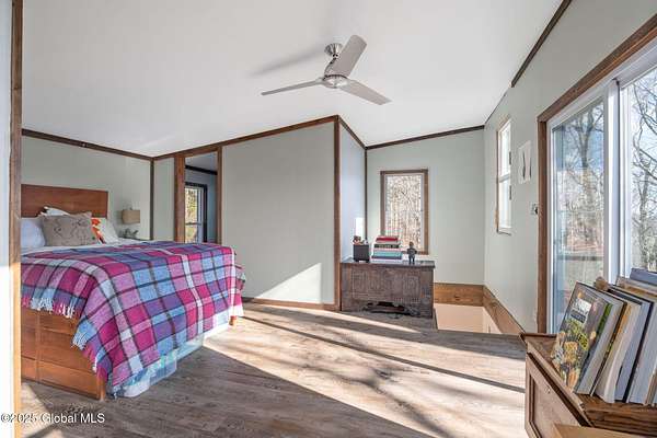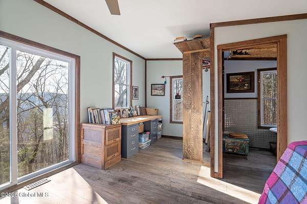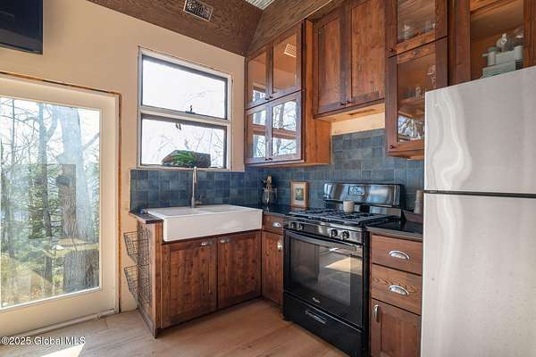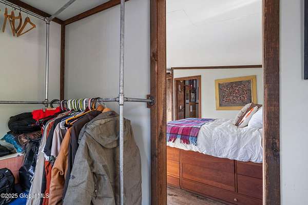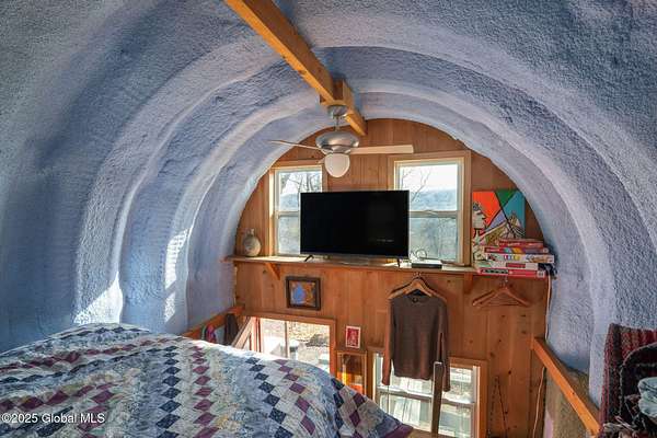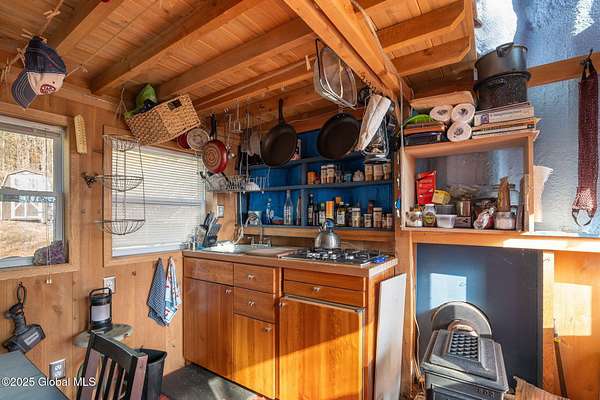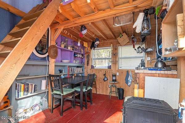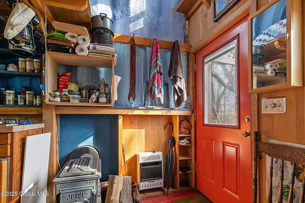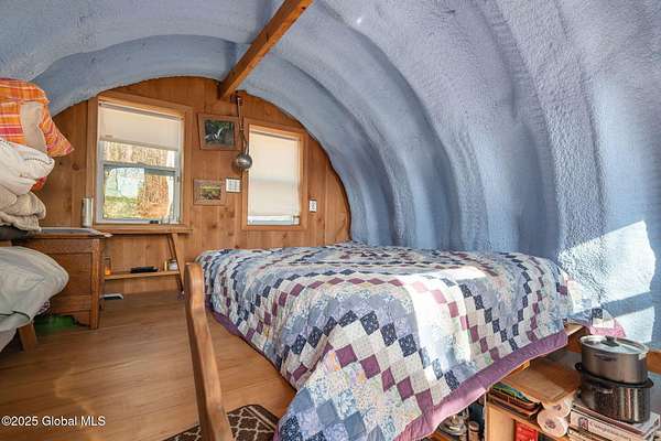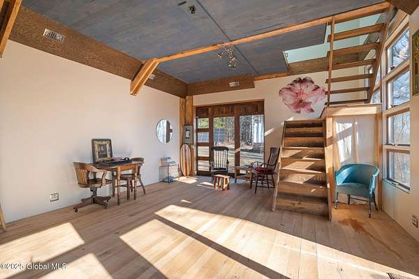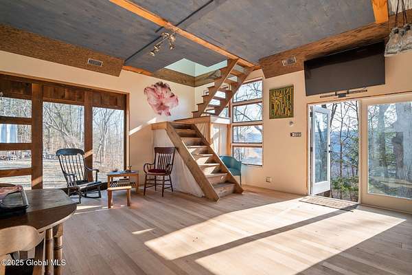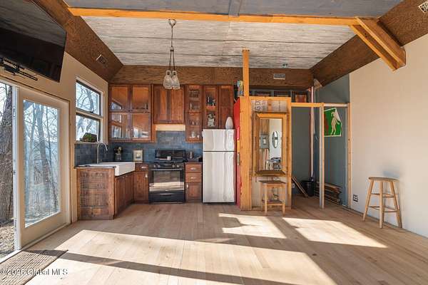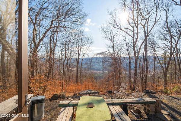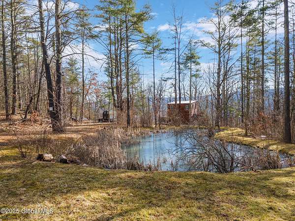 One-of-a-kind property; situated on 13.46 acres with a pond! The main house includes one bedroom with valley views, walk-in closet,1 br, full kitchen, and living area. This home boasts natural light & an open floor plan, w/ a 10-foot sliding door off the living room that beautifully connects the indoor living to outside. Additionally, the laundry/utility room includes LG washer/dryer, tankless hot water system and propane hot air furnace. The second home features a sitting area, mini-fridge and gas stove, butcher block counter, and queen bed loft, and heated by a wood stove and propane wall unit. Both homes are powered by solar energy and the water source is a drilled well. No septic, or perc. Cash or Conventional w/ Bank Of Richmondville. Home located on one mile private road.