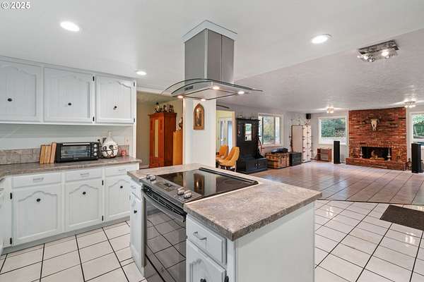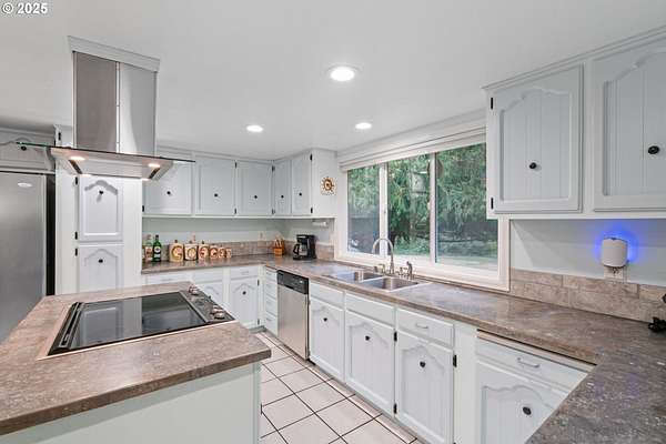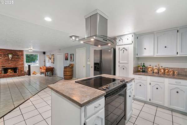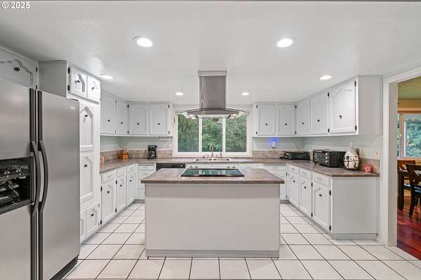 - Cook Island, Cooktop, Dishwasher, Free Standing Refrigerator, Stainless Steel Appliance, Tile