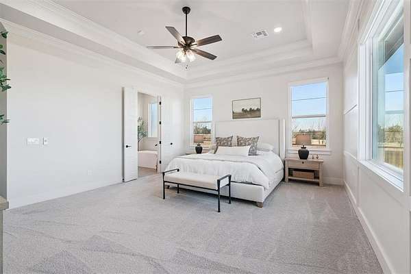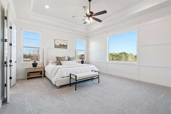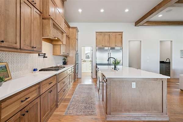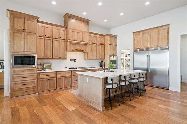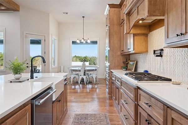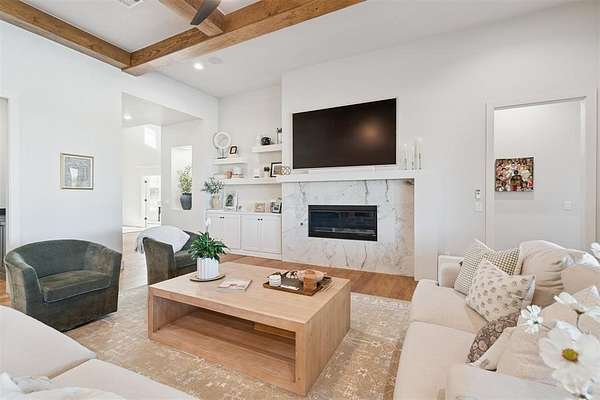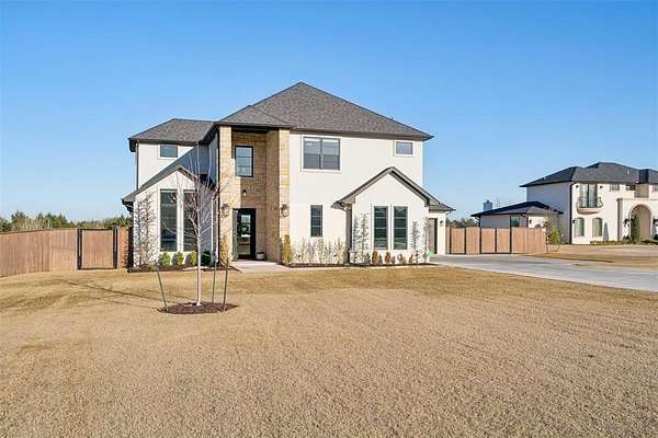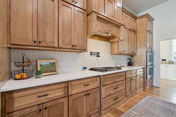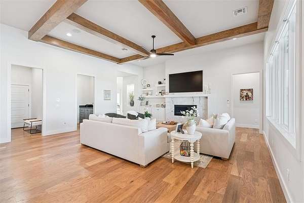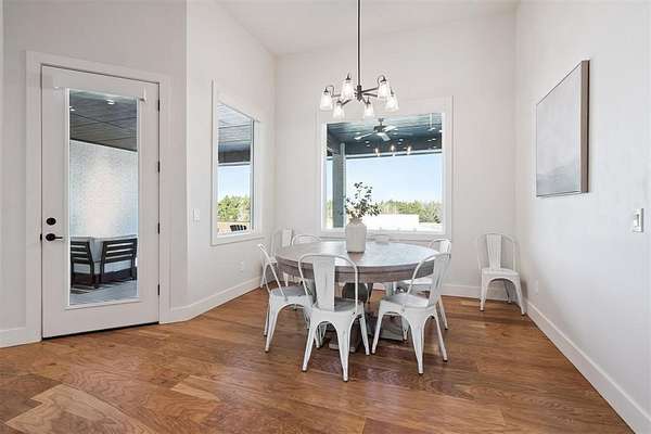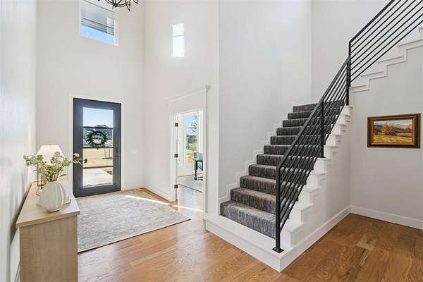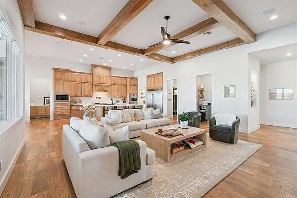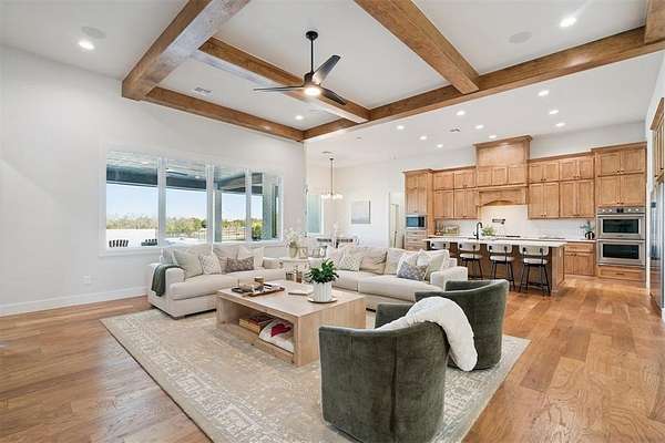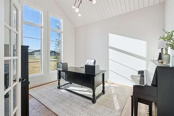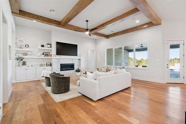 Stunning- better than new- home located in the highly sought after Addington Farms community. Step inside this remarkable residence and you are greeted by the two-story foyer with white oak floors that are carried seamlessly through the home. To the left is a private study with glass doors, floor to ceiling windows, and a shiplap vaulted ceiling. The great room offers a contemporary gas fireplace, built-in bookshelves, majestic wood beams, beverage station, and amazing views. The kitchen is a chef's dream - gorgeous custom cabinetry, island with bar seating, double oven, gas stove with pot filler, apron sink, commercial refrigerator, and the pantry of your dreams. The private main suite features a beautiful walk-in shower, soaking tub, double vanity, and a large walk-in closet with convenient access to the laundry room. The guest suite is in the north wing with private bath. Upstairs is a loft, walk-out attic space, two spacious bedrooms each with private vanity and shared bath space. Step out back to your private oasis - large, covered patio overlooking your gorgeous pool -- the view extending to the wooded back drop and pond. This is the spot- sit back- relax - you are home!!