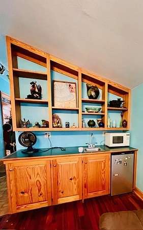 If you like the warm glow of Brazilian wood floors, hand crafted doors and wood work, a slate/native stone hearth with antique wood stove, and the inspiration of stained glass, you will love this 2 bedroom Ozark Cottage with wrap around porch, situated on 10 wooded acres overlooking a stocked pond and the Boston Mountains beyond. The former artist's original workshop is right next door with an overhead door with workbenches and a drafting desk, heated by a thermostatically controlled propane heater. Workshop opens to a back deck with 180 degree view. Your overflow guests and family will love the 2 BR apartment above the shop. Features are too many to list! Distinctive and unique to the Ozark Mountains located near 2 State Parks, and an easy commute to the University of Ar. at Fayetteville and Fort Smith. Sq footage includes apartment (ADU). Shown by Appointment.