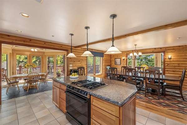 The home is thoughtfully designed to accommodate both tranquil relaxation and entertaining guests on a large scale. It features an impressive Great Room with natural timber beams and a striking floor-to-ceiling stone fireplace that serves as the focal point of the living area. Generous arrays of windows invite the outdoors in, with multiple wrap-around decks and covered stone patios, perfectly positioned to soak in sunrises, sunsets, and starlit skies.