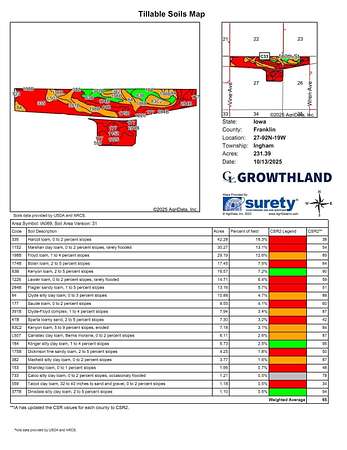 Located one mile east of Hansell, this 239-acre m/l property sits along 160th Street with a CSR2 of 65. Strong production history relative to the farm's soil ratings, contact agent for more information. Tile improvements were completed when the long-time owners purchased the property, though no maps tile maps are available. Available for the 2026 crop season. Seller open to splitting into multiple tracts, please contact the agent for more details.