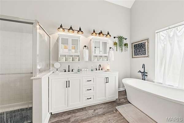 The main level includes a spacious primary bedroom with double closets and an updated en-suite bath. This luxurious retreat offers a vaulted ceiling, dual sinks, a free standing soaking tub, and a separate shower.