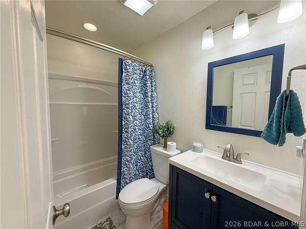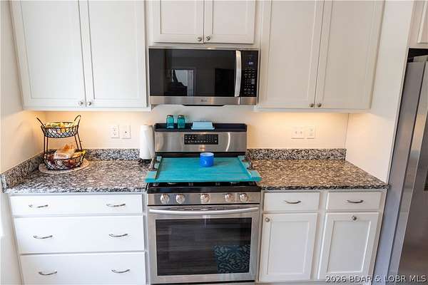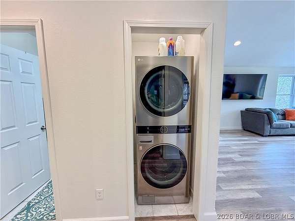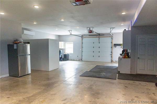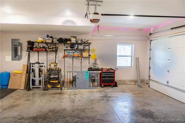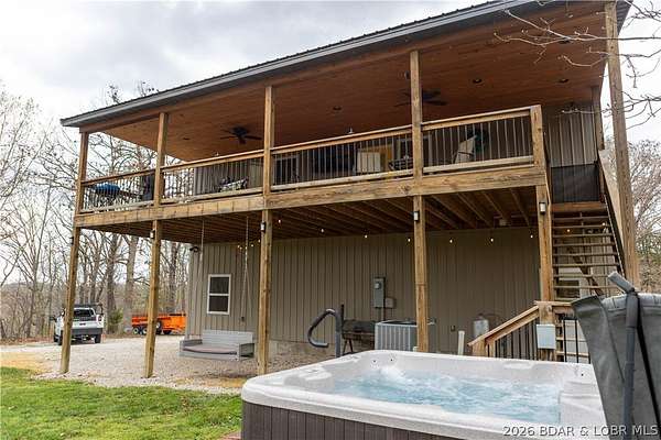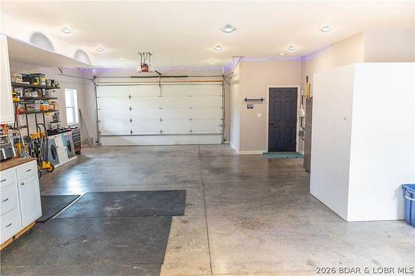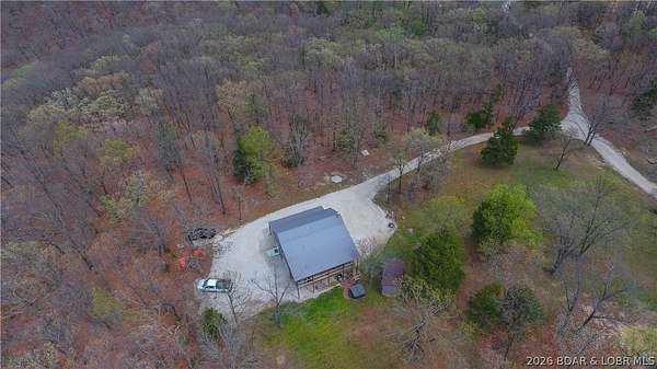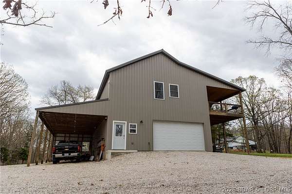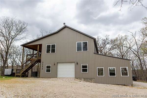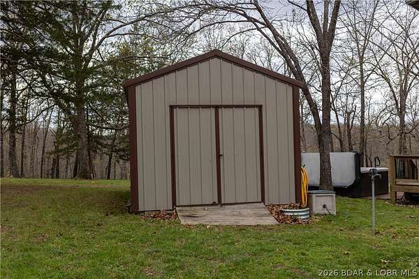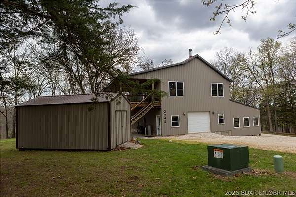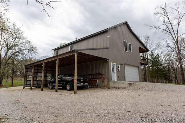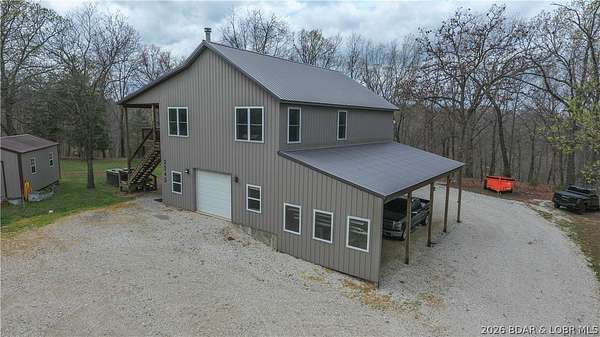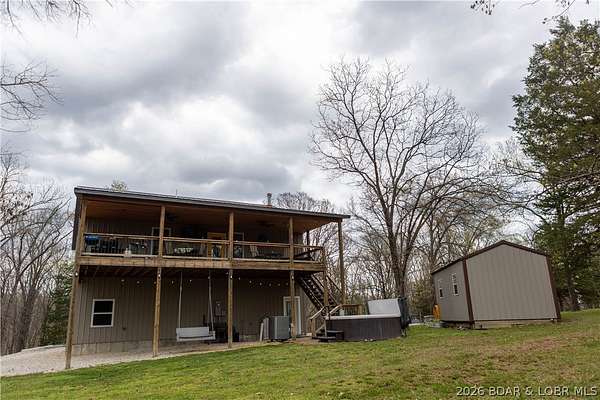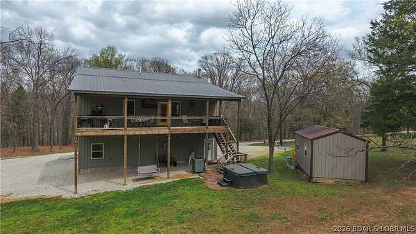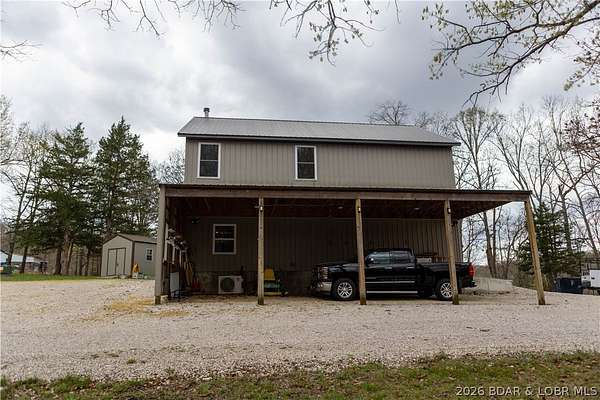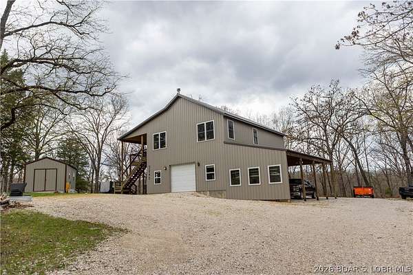 Situated on 4.43 acres just minutes from Camdenton, this property has just what you're looking for! The 30x40 garage/shop space has parking for 3 vehicles plus shop space, mini-split system to keep it heated and cooled, a half bath and a storm shelter/safe room. Upstairs you'll find a large open living area with wood burning fireplace and a beautiful kitchen with 42" cabinets, gas range, stainless steel appliances, and a large center island complete with granite counter tops. The primary suite features a large walk-in closet and bathroom with dual sink vanity and a walk-in shower. Also on the upper level is a 2nd bedroom with extra loft storage, a 2nd full bath and a laundry closet with washer and dryer included. Expand your living space with the huge 14'x36' covered deck and enjoy the beautiful park like setting or kick back and relax in the included hot tub. There's even more storage in the included 12x20 storage shed, and plenty of additional covered parking with overhangs on each side of the building. This one checks all the boxes so call today for your private showing!