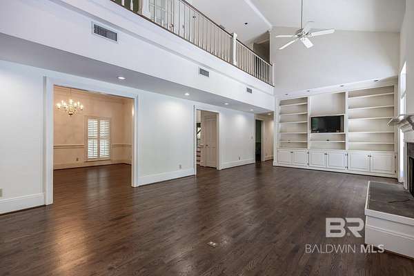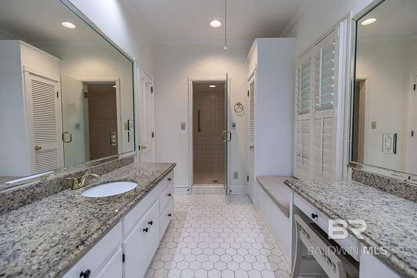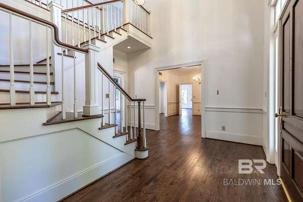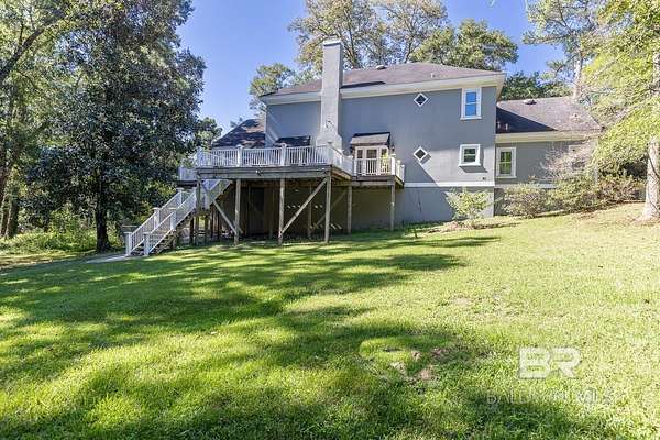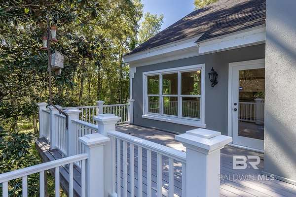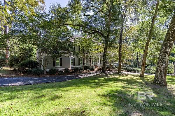 Stately custom-built home on scenic Fly Creek in Historic Montrose, nestled on two beautifully landscaped acres with mature trees and lush gardens. This one-owner residence, constructed by Bill Purvis, features a circular drive and elegant facade that welcomes you to a thoughtfully designed interior. The grand mahogany entry doors open to a spacious foyer with a quarter-turn staircase and views into formal living and dining areas. A cozy fireplace anchors the great room, which is filled with natural light from patio doors and transom windows. Custom built-in bookshelves and soaring ceilings highlight the mezzanine level. The kitchen is ideal for entertaining, with a granite island, gas cooktop, double ovens, pot rack, and seating for guests. A window over the double sink offers views of the side yard and Fly Creek frontage. The butler's pantry provides ample storage with tall cabinetry. The sunny breakfast room is surrounded by windows overlooking the private backyard with Bamboo, Oaks, and Magnolias. The main-level primary suite includes dual walk-in closets, double vanities, and a tiled shower with seeded glass. Upstairs are three additional bedrooms, one currently used as an office, with views of the lower level from the mezzanine. A whole-house generator adds peace of mind. Enjoy access to Mobile Bay and Fairhope Yacht Club via kayak or small craft. Buyer to verify all information during due diligence.