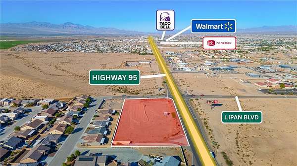 Prime 2.52-acre commercial corner lot located at the signalized intersection of Hwy 95 and Lipan Blvd, offering exceptional visibility, access, and exposure. Positioned on a major stoplight along Hwy 95 with traffic counts exceeding 18,000 vehicles per day (AADT), this site provides outstanding drive-by presence and controlled intersection access, making it ideal for a major QSR, gas station, or other high-traffic commercial users. The property features established ingress and egress, including direct highway access, allowing for smooth traffic flow and customer convenience. Utilities are available at the property line, and the site is fully improved with curb and gutter already in place. With its size, corner positioning, and strong traffic counts, this is a rare opportunity for businesses seeking a highly visible, ready-to-build commercial location.