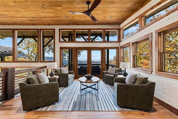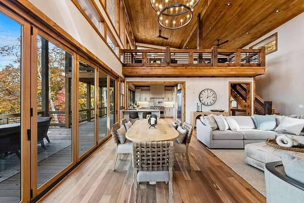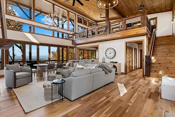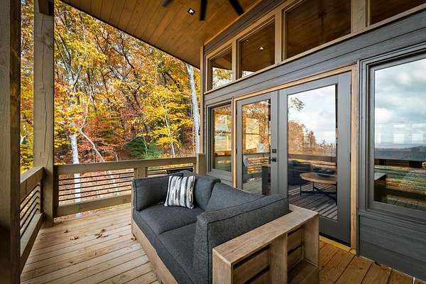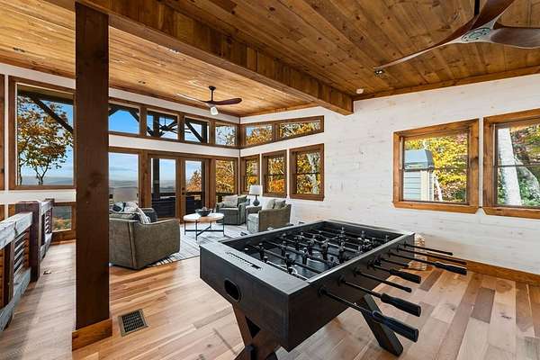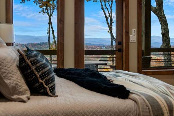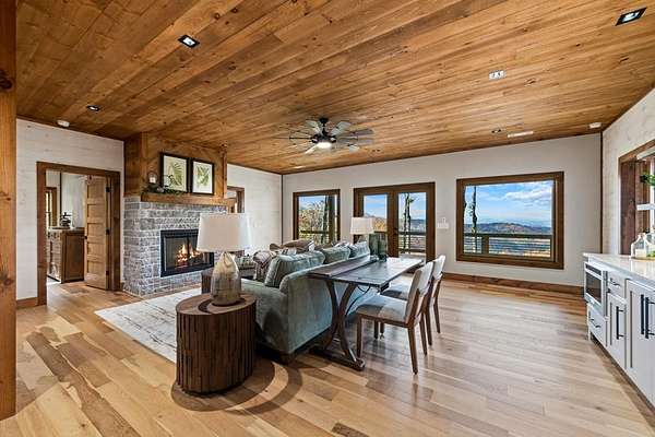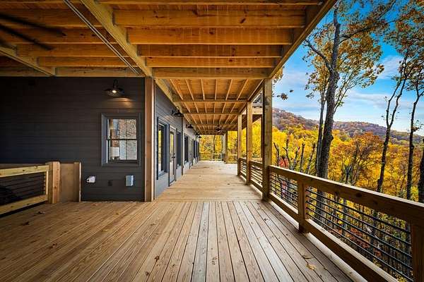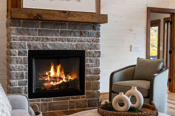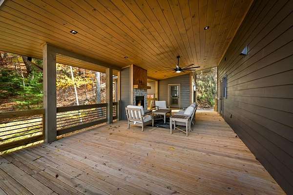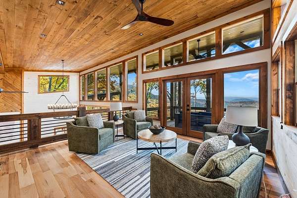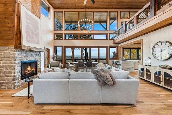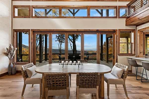 Tucked away in the coveted Aska Adventure Area, this brand-new mountain modern lodge captures the essence of refined mountain living. Just 10 minutes from downtown Blue Ridge with all paved access, it combines striking architecture, upscale craftsmanship, and sweeping long-range views that define the Blue Ridge lifestyle. From the moment you step inside, the mountains command your attention. The great room features soaring ceilings, walls of glass, and a dramatic stone fireplace that anchors the open floor plan. Every finish has been carefully selected--natural wood tones, clean lines, and designer lighting create a warm, modern yet timeless atmosphere that feels both elevated and inviting. The chef's kitchen is as functional as it is stylish, showcasing granite countertops, high-end stainless-steel appliances, and an accordion-style window that opens to the mountain air. The adjacent dining area flows seamlessly, making it ideal for gatherings that celebrate both good food and great views. The primary suite on the main level offers a serene retreat with a spa-inspired bath featuring a tiled walk-in shower, soaking tub, and private deck access where an outdoor fireplace glows beneath the stars. On the terrace level, you'll find a spacious entertainment room centered around another stone fireplace, along with three additional bedrooms and two full baths--each thoughtfully designed to offer comfort and privacy. Expansive outdoor spaces capture the beauty of the surroundings, featuring fireplaces on every level, generous decks, and inviting areas to gather or unwind. The finished garage enhances the home's versatility--perfect for additional storage, creative use, or future expansion. Whether enjoyed as a full-time home, weekend retreat, or investment opportunity, this newly built lodge delivers a rare blend of luxury design, thoughtful functionality, and awe-inspiring mountain views--an exceptional expression of modern mountain living.