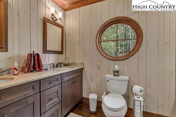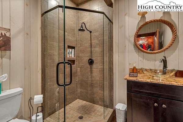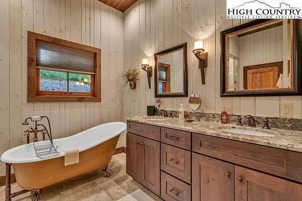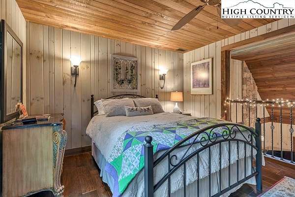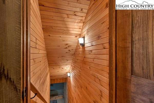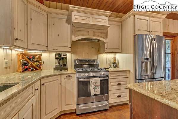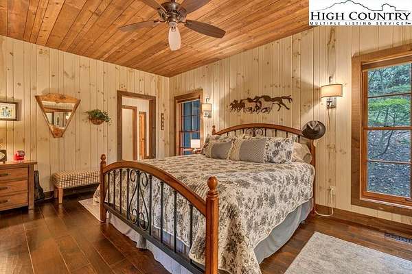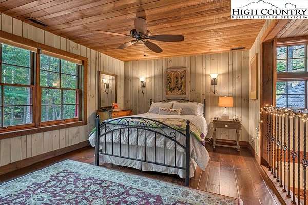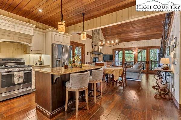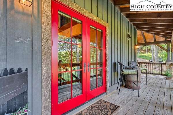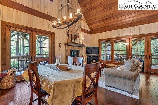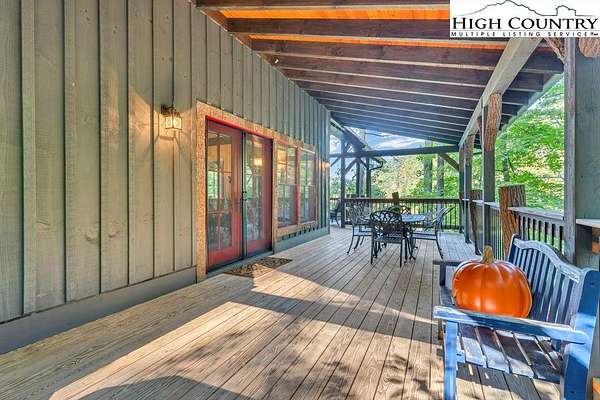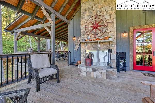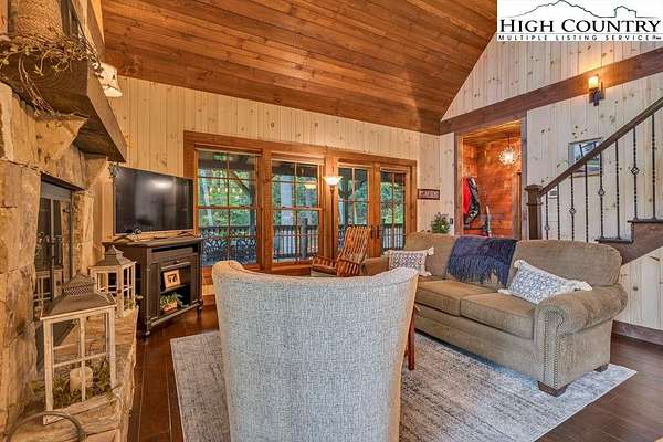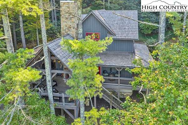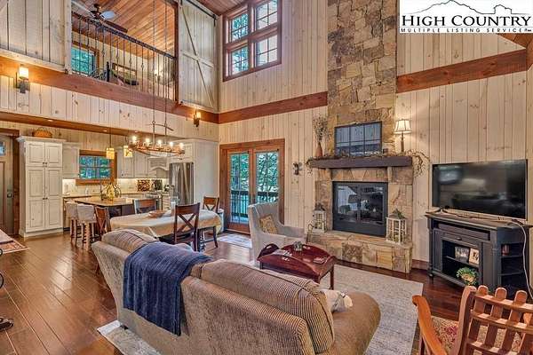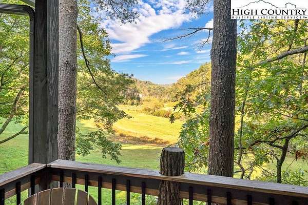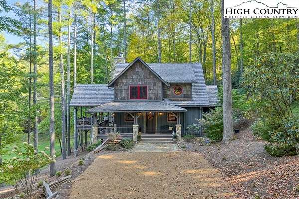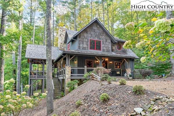 Experience timeless mountain living in this Adirondack-style rustic retreat, nestled within the highly desirable Valle Cay community of Valle Crucis. Designed by Moss Creek as the Cumberland Trace plan and thoughtfully enhanced, this home exudes warmth, charm, and understated luxury in a serene private setting. The soaring great room welcomes you with rich hardwood floors, a dramatic stone fireplace, expansive windows, and vaulted ceilings that flood the space with natural light. The open layout flows seamlessly into the gourmet kitchen, complete with a gas range, stainless steel appliances, and hard-surface countertops. A dining area adjoins the space, making it perfect for both everyday living and entertaining. Wrapped on three sides with covered decks, the home invites you to embrace outdoor living year-round. Enjoy sweeping views of the lower valley and nearby Baird's Creek from multiple vantage points, or gather by the striking outdoor wood-burning fireplace. The main level features a private primary suite with spa-like ensuite bath, showcasing tile floors, a walk-in shower, and a soaking tub. An additional full bath with shower and a conveniently located laundry room complete this level. Upstairs, two oversized bedrooms share a full bath with tub/shower combination. A bonus closet space, currently used as a small bunk room, offers flexible use as storage or sleeping quarters. The lower level includes a utility room, ample storage, and exterior access. Valle Cay enhances the lifestyle with scenic hiking trails, tranquil ponds for fishing or canoeing, and the peaceful setting of Valle Crucis just beyond. The community offers the Mast General Store, local school, Valle Crucis Park, and Watauga River access for fly-fishing, tubing, and more. Only a short drive to Boone, residents enjoy access to fine dining, shopping, medical facilities, and Appalachian State University. With three ski resorts, the Blue Ridge Parkway, and charming mountain towns nearby, this property is a perfect year-round sanctuary. This exceptional home blends rustic elegance, modern comforts, and an unparalleled location -- a rare opportunity to own in Valle Cay.