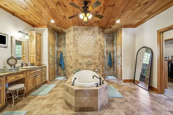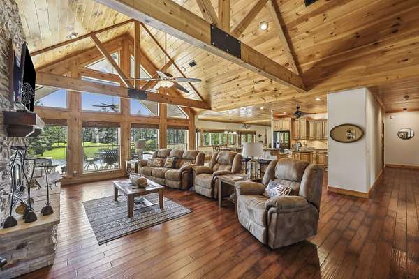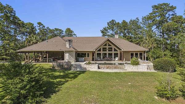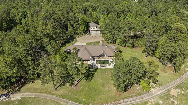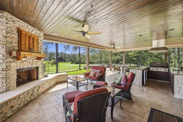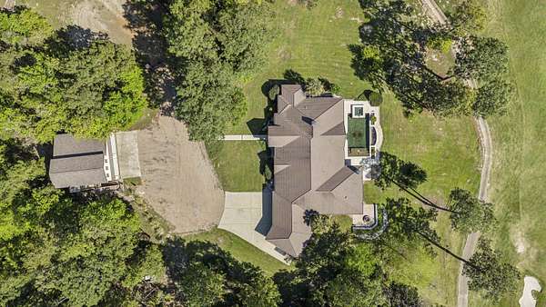 Discover unparalleled luxury in this stunning 3 bedroom 2 full, and 2 half-bath Golf front at Rayburn Resort. Spanning 3,664 sqft on 3.05 acres, this property boasts hardwood floors, high ceilings, and multiple fireplaces. Start your day with mesmerizing views from the infinity pool and hot tub, perfectly positioned overlooking the golf course. Enjoy gatherings on the covered patio featuring an outdoor kitchen, wood-burning fireplace, shower, and half bath. The primary suite is a retreat with a massive bath, soaking tub, double vanity, walk-through double shower, and spacious walk-in closet. Culinary adventures await in the gourmet kitchen. Access the golf course via gated cart path from your 3-car garage with golf cart bay. The additional oversized garage offers a guest apartment with 2 bedrooms, 1 bath, and kitchenette. Embrace the option of either water well and community water supply, just minutes from Lake Sam Rayburn. Experience elegance and comfort in this exceptional property!
