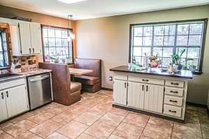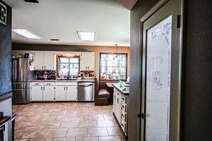 KITCHEN/DINING: 16.8 x 19, Ceramic tile flooring, taupe textured walls, white textured ceilings, fluorescent lighting, extra-large pantry, lots of stained kitchen cabinets with formica tops and ceramic tile backsplash, new farm kitchen sink, garbage disposal, new stainless dishwasher, new stainless electric kitchen stove, stainless refrigerator, window for plants above the sink. A cafe booth is situated in the corner so that you can look out over the yard while eating.