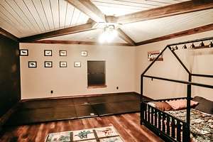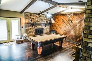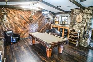 GAMEROOM: 17.8 x 16.6, Laminate wood look flooring, vaulted ceiling with stained solid wood beams, new light fixture, recessed lighting, raised brick painted fireplace with wooden mantle above and side upholstered leather seating, a wall of stained car siding, and a brick wall with built-in bookcases and cabinetry.