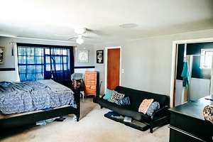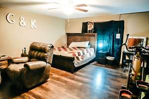 BEDROOM 3: 23 x 30, Wood look laminate floors, beige and navy textured walls, new light fixture. Large 8.6 x 9 walk-in closet with built-in shelving.