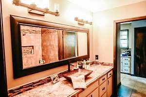 BATHROOM: Ceramic tile flooring, taupe textured walls, white textured ceilings, long vanity with granite look formica top countertops, cabinetry below, mirror and lighting above, extra-large ceramic shower and commode.