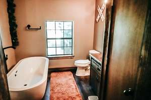 BATHROOM: Ceramic tile flooring, commode, 6'oval tub, vanity, shelving and hot water closet.