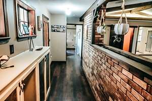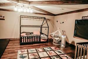 OFFICE/NURSERY: 8.6 x 9.6, Wood look laminate floors, , beige textured walls, one navy textured wall, and new light fixture.