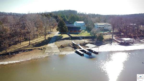 Waterfront living at its finest on the Lake of the Ozarks! Nestled in a quiet no-wake cove, this property offers the perfect blend of privacy, recreation, and everyday comfort. With its own boat ramp and generous waterfrontage, you'll enjoy elbow room on the water plus the opportunity to expand if desired. The home features a semi-open floorplan designed for convenience, with all main-level living including the kitchen, dining, living room, laundry, master suite, and a second bedroom. Upstairs, two spacious bedrooms share a Jack-and-Jill bath, each with its own private deck overlooking the lake. Step outside to a large, covered patio with sweeping views of your private two-well dock, connected by a concrete sidewalk for easy access. The well-manicured lawn reflects pride of ownership, while ample parking ensures room for friends and family. A detached shop up the drive provides excellent storage for boats, lake toys, or hobbies. Set on over 7 acres, with approximately 5.5 acres ready for a walking trail or the addition of another shop, this property offers endless possibilities. Whether you're seeking a full-time residence or a weekend retreat, this lakefront home delivers the space, amenities, and lifestyle you've been searching for.
