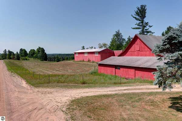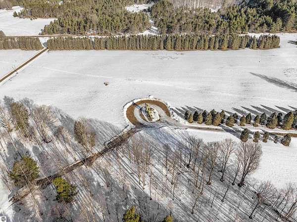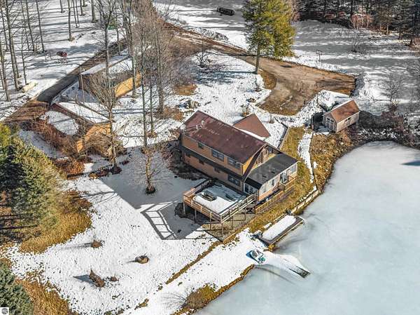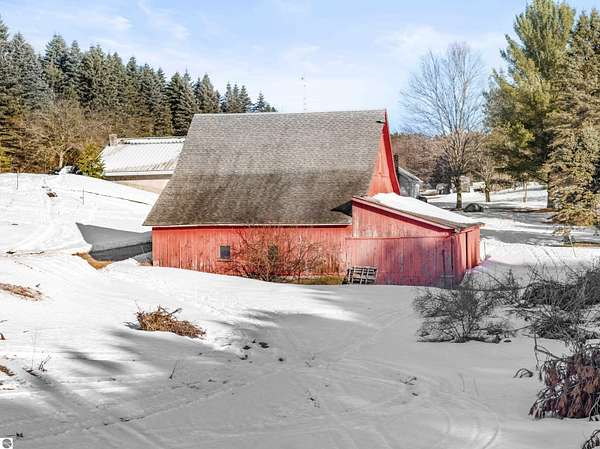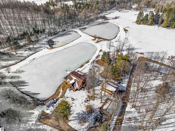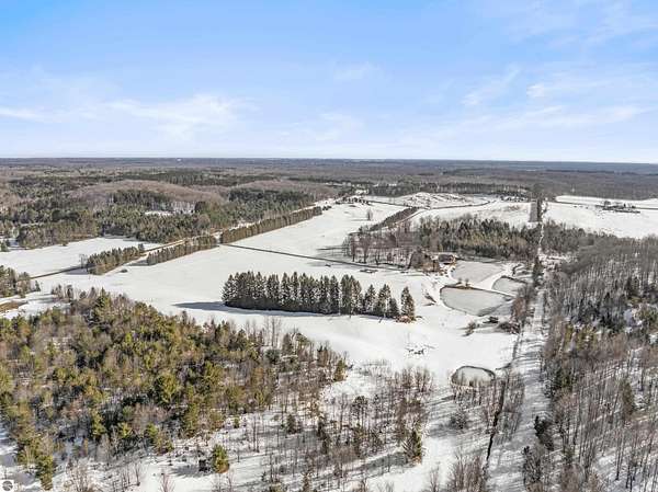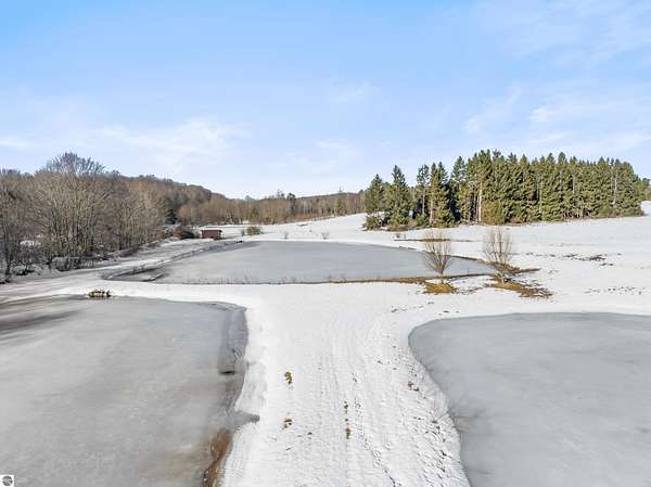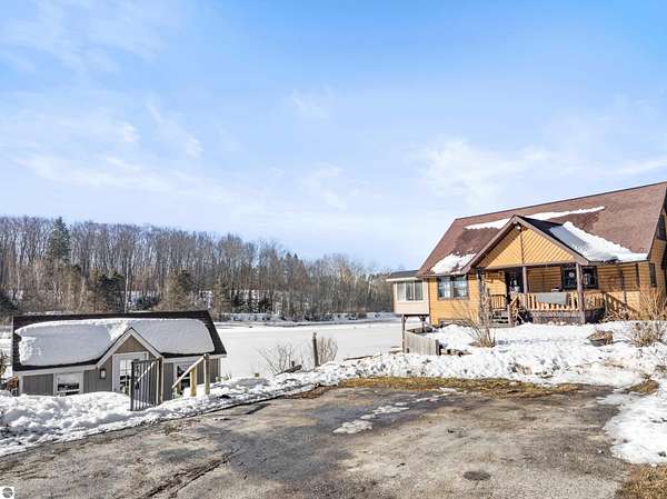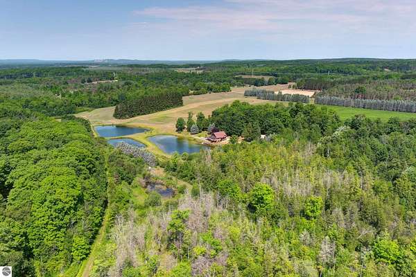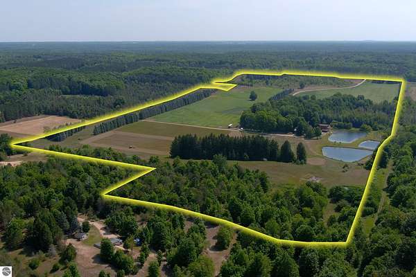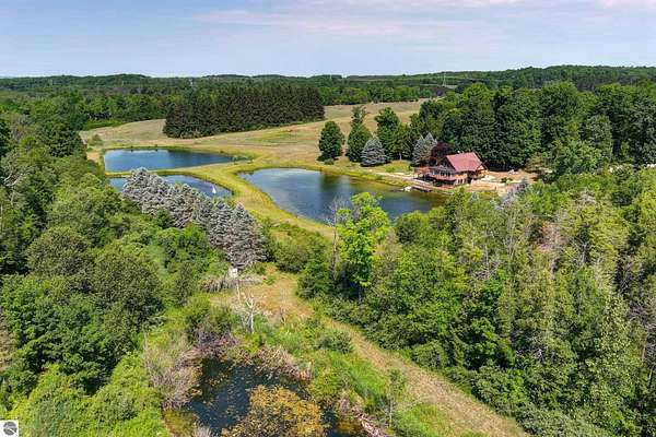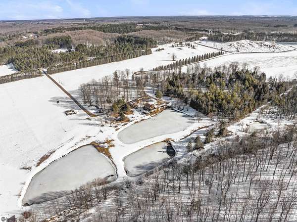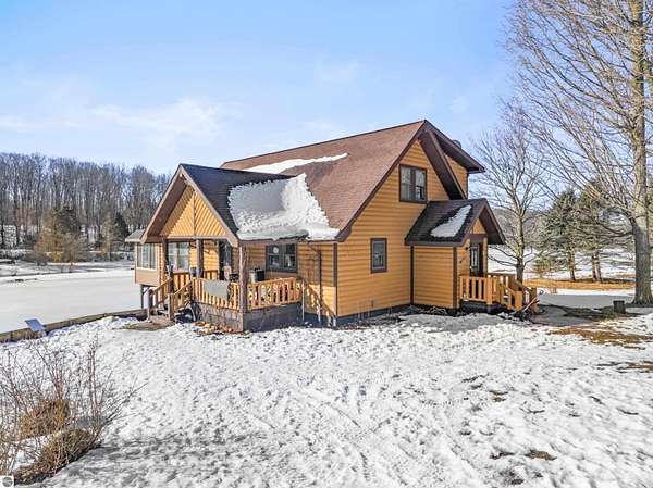 Natural beauty surrounds this 100+/- acre private estate in Northern Lower Michigan. A long winding drive leads to a custom-built, waterfront cottage-style home perfectly set in its peaceful country setting. Move-in ready, this property is ideal as a private retreat, lodge, or homestead. Thoughtfully designed for deer management and migratory waterfowl, the land includes approximately 60 acres in planned agricultural production. The cedar log-sided home is filled with natural light and offers stunning views from every level. Plenty of room for horses, cattle, or other livestock, plus a greenhouse and large root cellar to support your harvest. Two 24’x30’ insulated garages with heat, power, and water provide ample space for equipment and toys. A waterside cabin with power awaits your finishing touches. Woods, fields, and rolling terrain offer exceptional hunting and recreation, along with a stocked private lake for fishing and paddling—your up-north escape awaits.