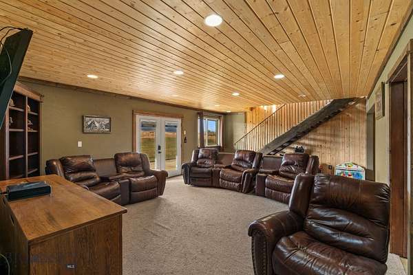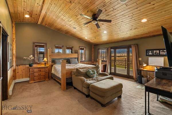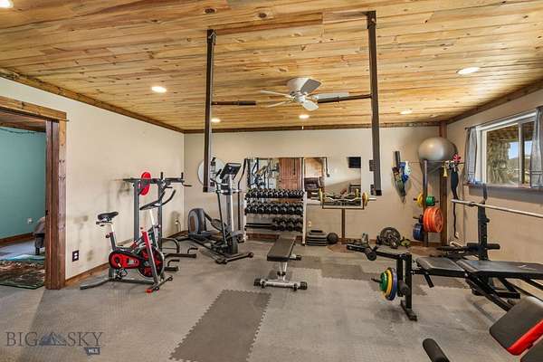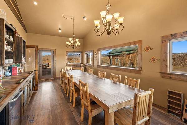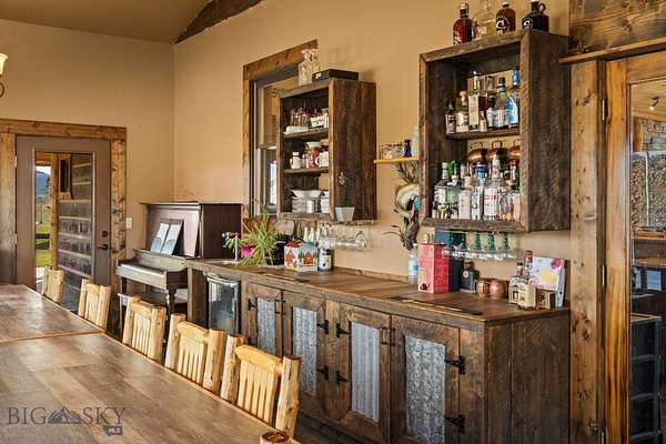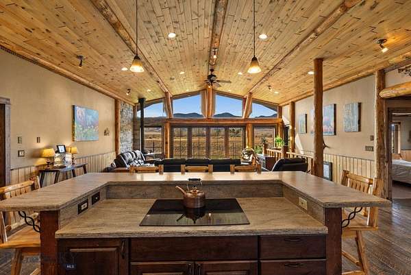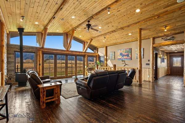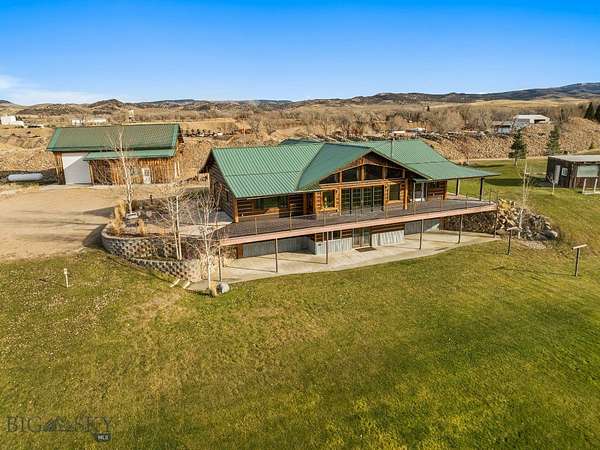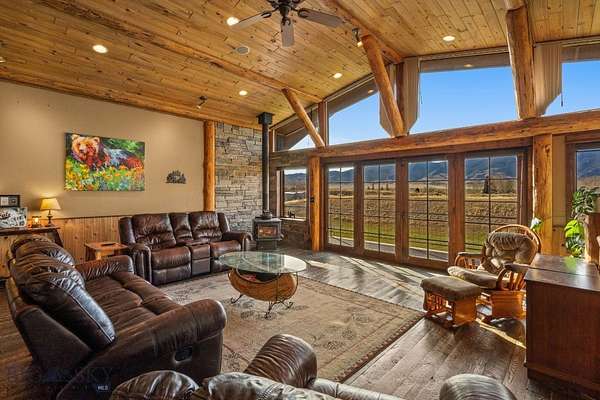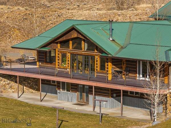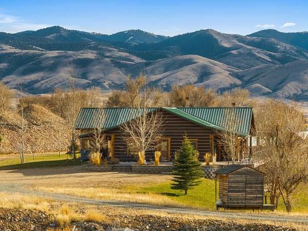 This captivating residence commands attention with its grand scale and rustic details. Expansive front windows frame breathtaking views of the Ruby mountains. Thoughtfully designed to harmonize with its surroundings, the home features nature-inspired textures and earthy tones, including corrugated tin siding paired with fir log accent. Built in 2011, this home offers open concept kitchen and living room, four bedrooms plus a bonus room easily utilized as a fifth bedroom, 3 bathrooms, spacious dining room with a bar, gym, & large laundry room. The kitchen is a chef's dream, equipped with stainless steel appliances, durable non-porous Corian countertops, and soft-close cabinets. For hobbyists or mechanics, the massive garage/shop includes a storage loft and additional living quarters. Test your green thumb in the large greenhouse. Relax next to the wood stove surrounded by cozy lodge ambiance. Unwind on the spacious front deck, take in panoramic views, and enjoy the meticulously landscaped yard with underground irrigation. This home is a true masterpiece of comfort and craftsmanship.