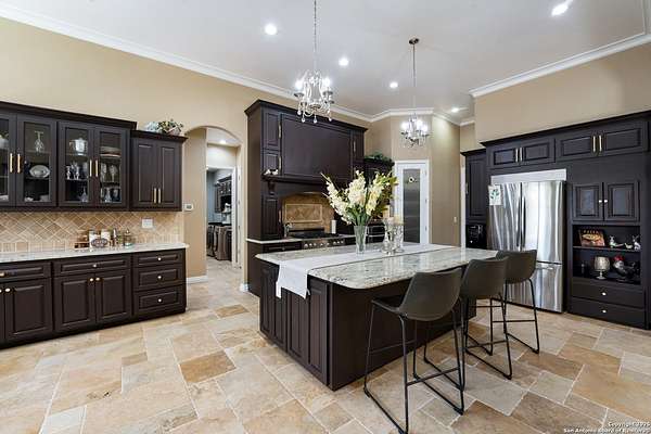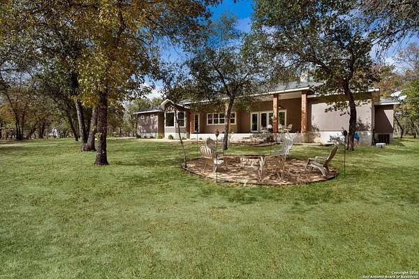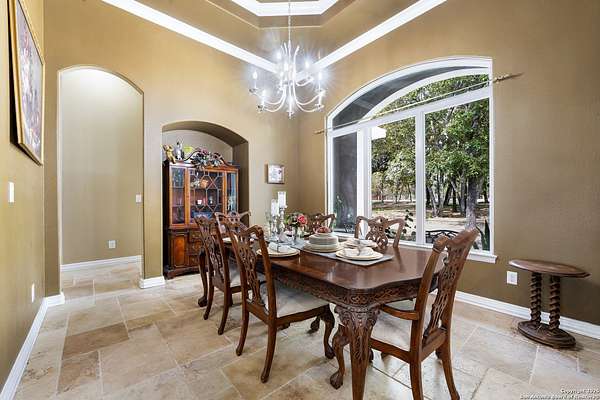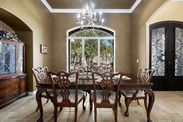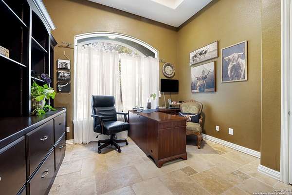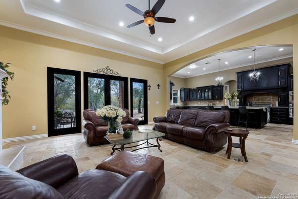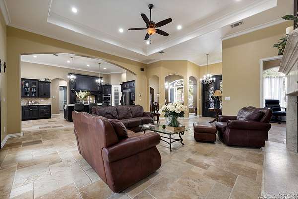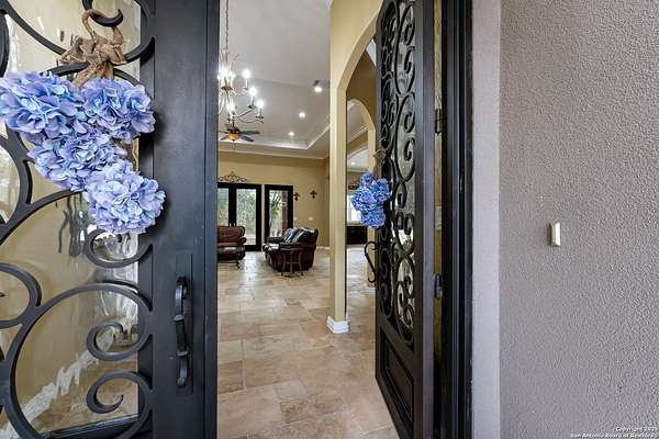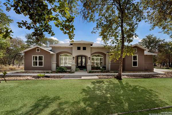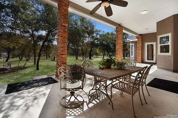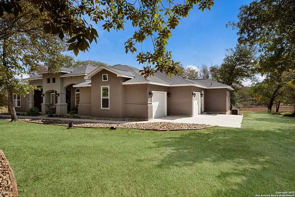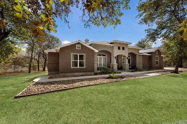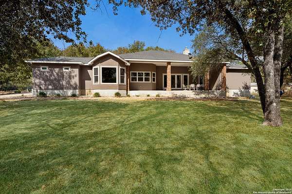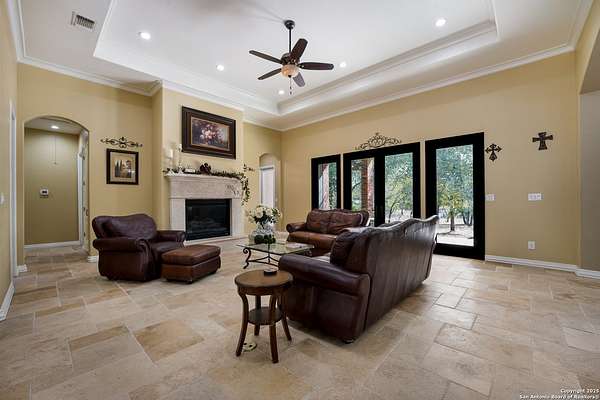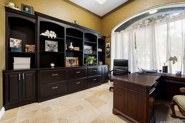 30 minutes from downtown San Antonio. Tucked off Priest Rd, this custom single-story delivers big, open living: a chef-style kitchen with oversized island, natural granite, and pendant lighting flows to a tray-ceiling great room with fireplace and tall windows. Primary suite retreats with wood floors, bay window sitting area, and a spa bath with dual vanities, walk-in shower, and jetted tub. Work-from-home ready office with built-ins. Travertine-style floors, crown molding, and wrought-iron double doors elevate the entry. Out back, a wide covered patio with brick columns and lots of shade sets the scene for easy indoor-outdoor living. Come see the space, light, and layout that make this one feel like home.