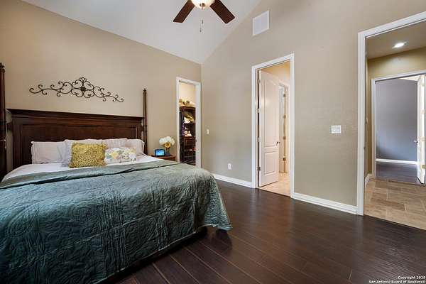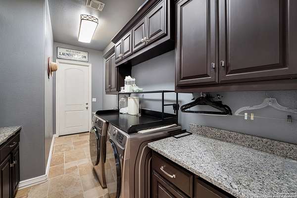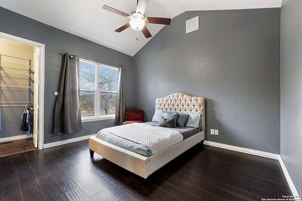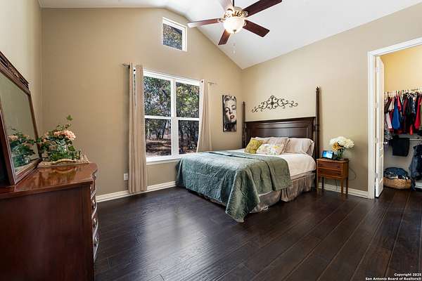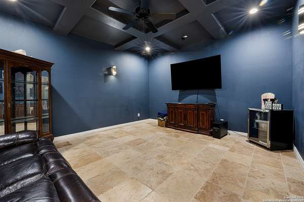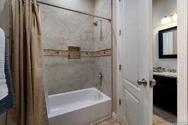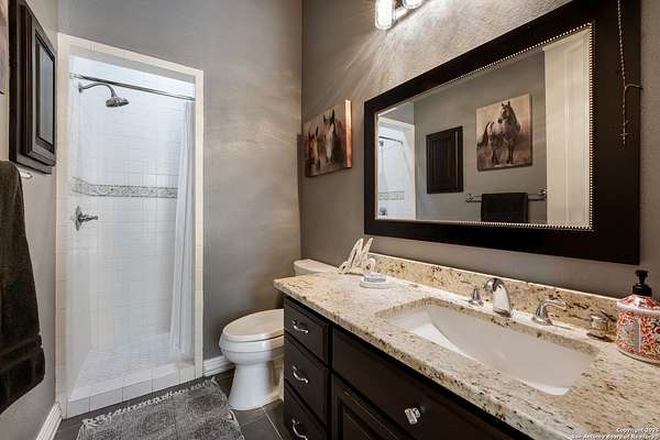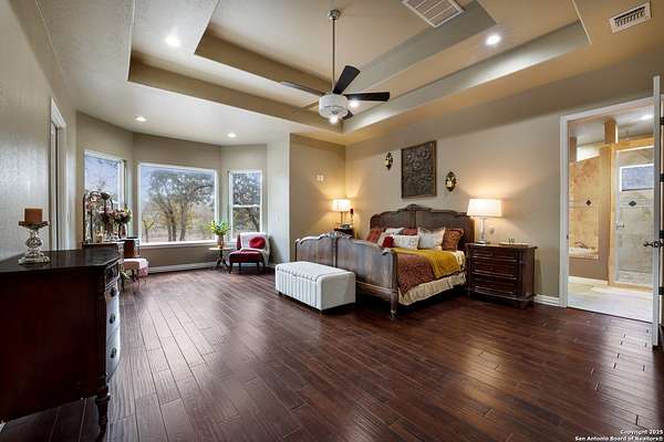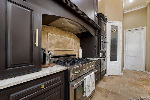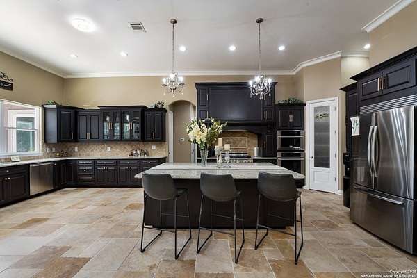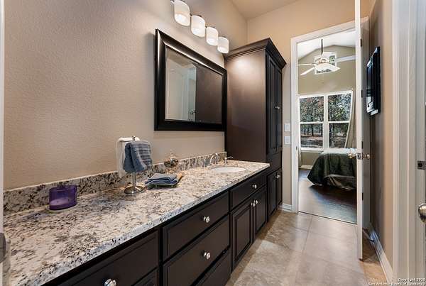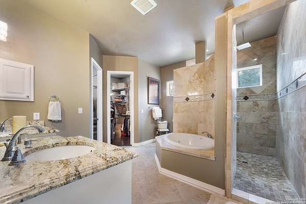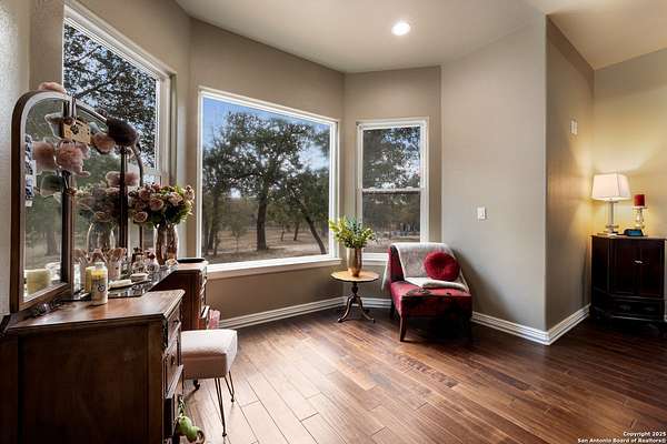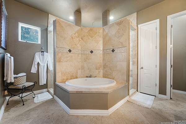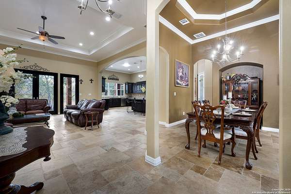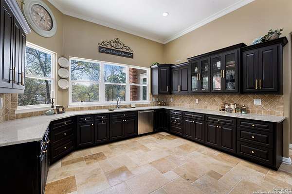 30 minutes from downtown San Antonio. Tucked off Priest Rd, this custom single-story delivers big, open living: a chef-style kitchen with oversized island, natural granite, and pendant lighting flows to a tray-ceiling great room with fireplace and tall windows. Primary suite retreats with wood floors, bay window sitting area, and a spa bath with dual vanities, walk-in shower, and jetted tub. Work-from-home ready office with built-ins. Travertine-style floors, crown molding, and wrought-iron double doors elevate the entry. Out back, a wide covered patio with brick columns and lots of shade sets the scene for easy indoor-outdoor living. Come see the space, light, and layout that make this one feel like home.