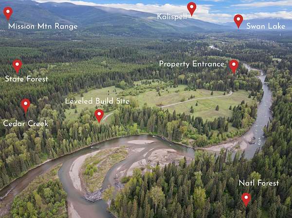 Potential Owner Finance Option - Rare 85-Acre Swan Valley Sanctuary. Your Montana Legacy Awaits! Discover an extraordinary property in the heart of Montana's Swan Valley, just 30 minutes south of vibrant Bigfork and under 15 minutes from serene Swan Lake. This wonderful property offers a rare combination of unmatched privacy, pristine waters, open meadows, and direct access to hundreds of acres of State and Natl Forest land. Immerse yourself in nature with over half a mile of the Swan River and more than 2,000 feet of Cedar Creek running through the property, it's a true outdoorsman's paradise, perfect for fishing, wildlife watching, and exploring Montana's wild landscape. A newly built road winds into the property, where the primary home site has been leveled and positioned near the river to take in the natural sights and sounds. It's the ideal location for a private estate, unburdened by covenants or zoning restrictions, this property is a blank canvas for your Montana vision. Listen to the river flowing from the build site, watch deer and elk herds bed down through the open meadows, while the birdsongs slightly echo throughout the day. Watch the Swan and Mission Mountains come alive with unforgettable sunrises and sunsets, capturing the essence of Big Sky Country. This property is a rare opportunity to create a recreational retreat, hunting base, or family legacy estate less than an hour from the amenities of Kalispell. A perfect balance of remote tranquility and convenient accessibility; a place to unplug, explore, and experience Montana the way it was meant to be. Request the property highlight video to see the property from afar.
