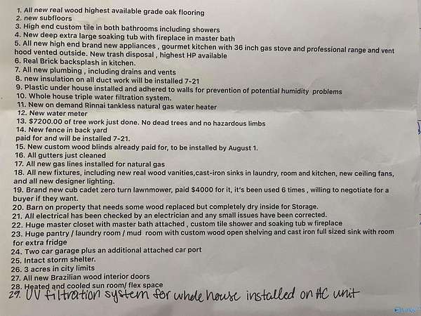 Full Brick,Inside City limits,3 bedroom and 2 baths, fully Renovated!!! 2 acres,with a barn and storm shelter, screened in back porch,plus a covered back patio area or use it as covered storage. Roof is only 4/5 years and everything else has been totally re-modeled with new everything!!New water lines and gas lines. A beautiful soaking tub with fireplace in bathroom,large dressig area, walk in/thru master closet, beautiful custom tile in both baths, custom light fixtures, very unique design. The kitchen is absolutely stunning with herringbone brick backsplash and beautiful vent a hood, and a large laundry room/ working space with floating shelves. 2 car garage all on 2 Acres.