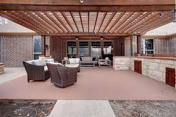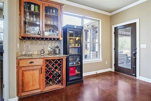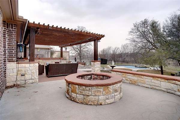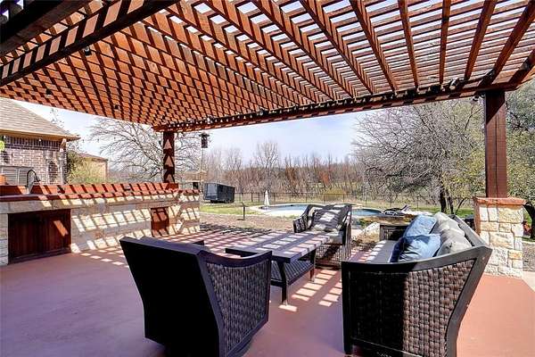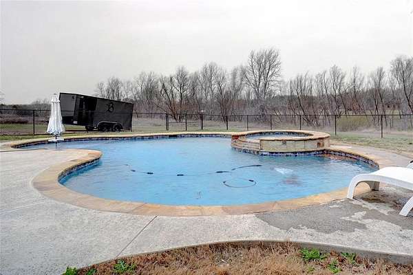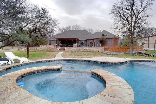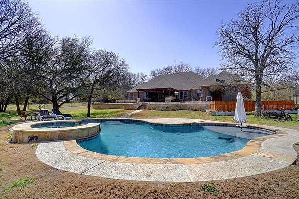 Exceptional custom single story home sitting on over 4 acres in sought after Quail Springs neighborhood with beautiful landscape and abundant wildlife, including deer sightings, this property is a nature lover's dream. Enjoy the outdoor entertainment area with a covered patio, outdoor kitchen space, fire-pit and stone retaining wall leading you down to the sparkling pool & spa, making this a true outdoor oasis that boasts peaceful scenery to enjoy and entertain with family & friends. Inside, this gorgeous 3-bedroom, 2 full and 1 half bath home features stained concrete floors, decorative lights, gorgeous views from all rooms, plenty of natural light and split bedroom floor plan. Chef's kitchen offers granite counters with abundant cabinetry, large island and a dry bar with wine storage. Extras include a private office, formal dining room and great utility room. The oversized garage provides ample space for vehicles, in addition the adjacent 30x60 metal building makes a great workshop or storage, not insulated and no electricity. Horses are allowed in the community. Students attend Peaster ISD. Property includes adjacent right side, heavily treed lot but not the creek, it's just adjacent too it. Don't miss this opportunity to be part of a close-knit, well-maintained community! Listing includes lot on 220 Falcon Drive, parcel#R000083290.