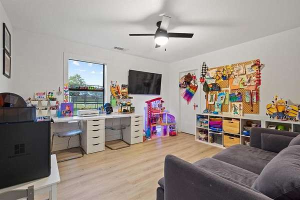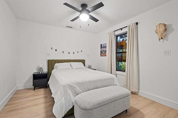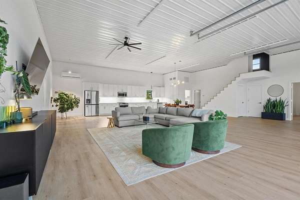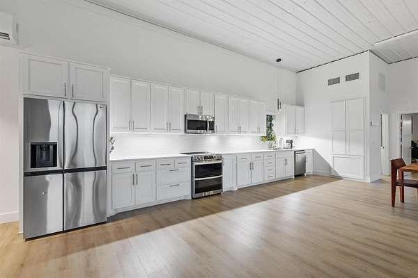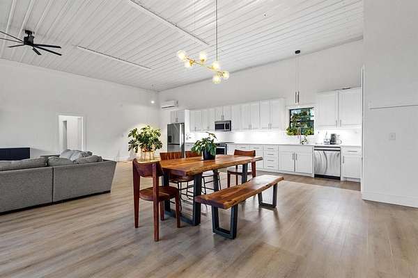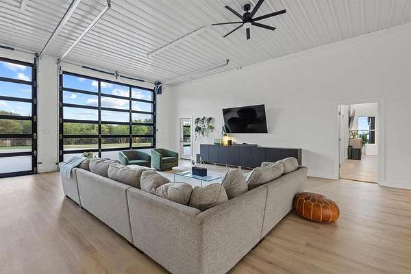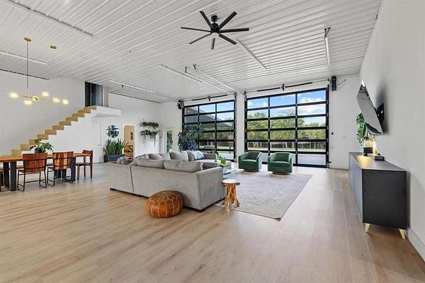 The spacious living and dining areas feature full-view glass garage doors that flood the interior with natural light and seamlessly blend indoor and outdoor living. The kitchen is complete with white cabinetry, quartz countertops, stainless steel appliances, and abundant storage, ideal for both family life and entertaining.