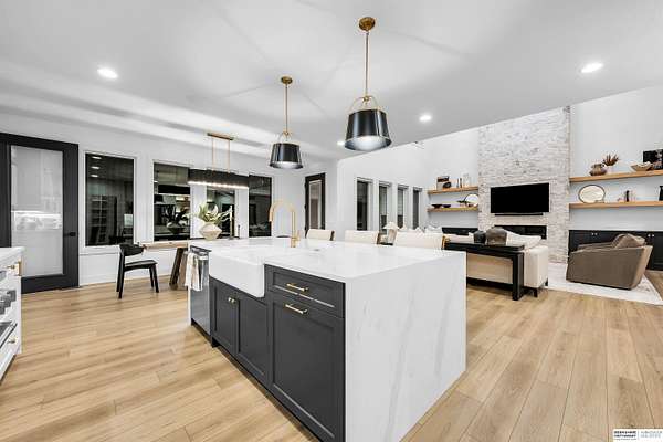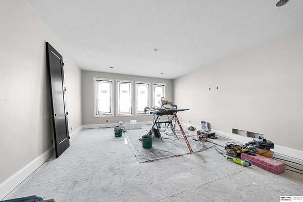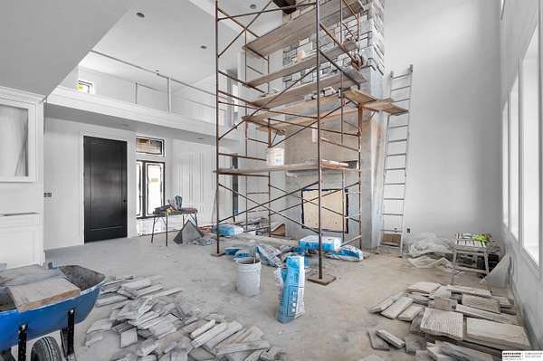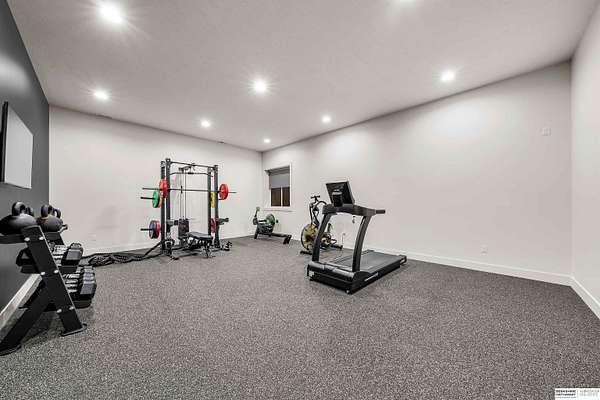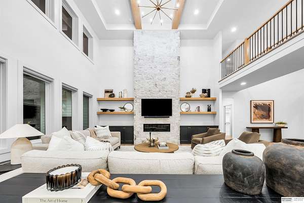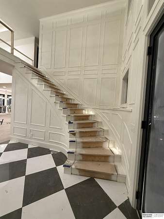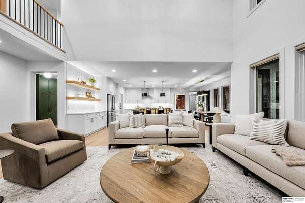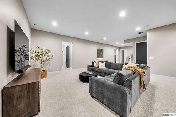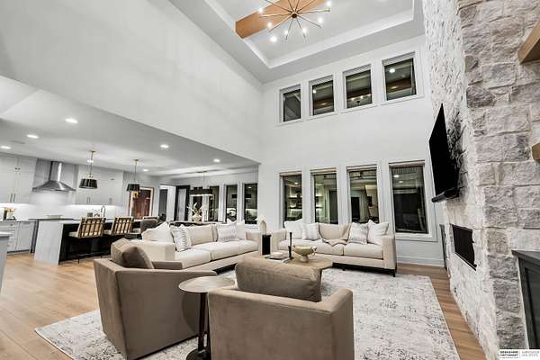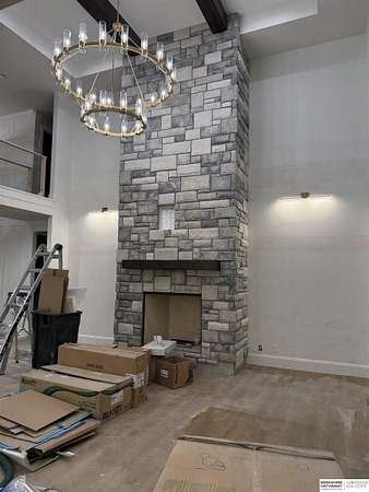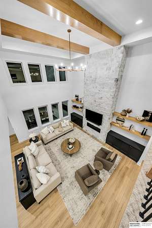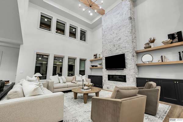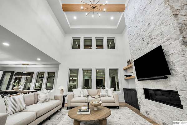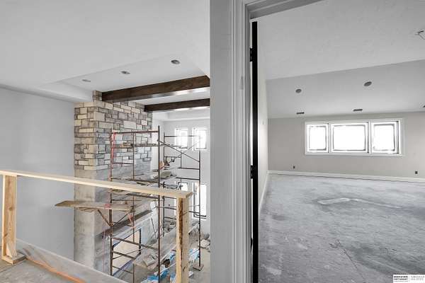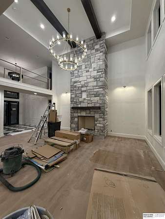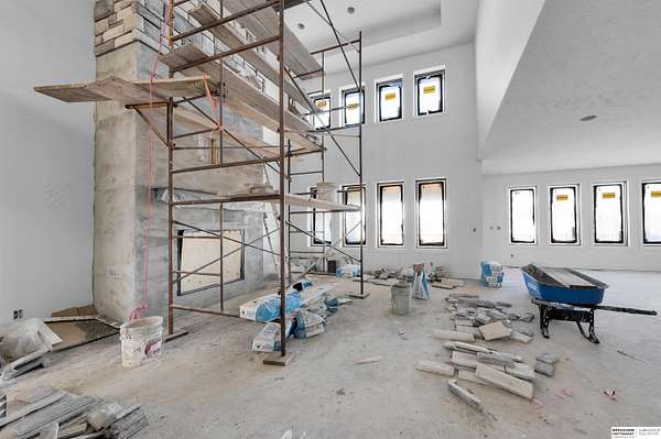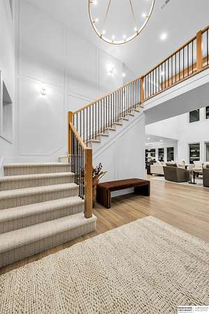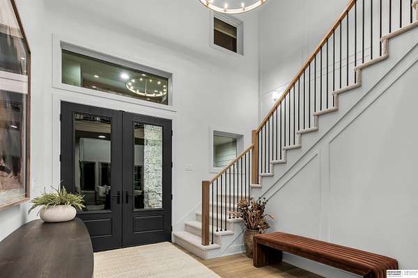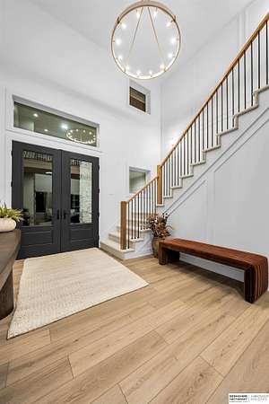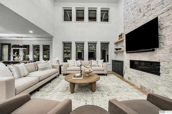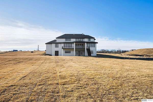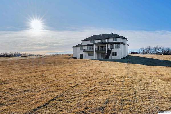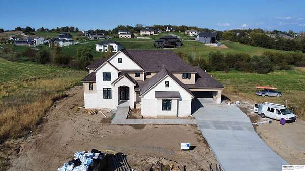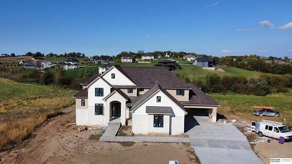 Joe Evans, M: 402-612-7993, joe3evans@gmail.com, https://www.bhhsamb.com - Acreage living awaits in this extraordinary 1.5-story home by iCON Homes, perfectly situated on 1.5 acres in the highly sought-after neighborhood The Estates at Wynnwood. Step inside and be captivated by the circular staircase, open great room with its striking floor-to-ceiling brick fireplace, a chef-inspired gourmet kitchen featuring a stunning waterfall island, and an expansive walk-in pantry. Your private oasis offers panoramic views of lush greenery and mature trees, creating an unparalleled sense of peace and privacy. The main floor boasts a luxurious primary suite with a spa-like bath, including a soaker tub, walk-in shower, and huge custom closet, plus a convenient home office. Upstairs, you'll find three additional bedrooms, two baths, and a spacious bonus room. The lower level is an entertainer's dream--complete with an 11 foot drooped floor gym, full bar, additional bedroom with bath, and a large rec r