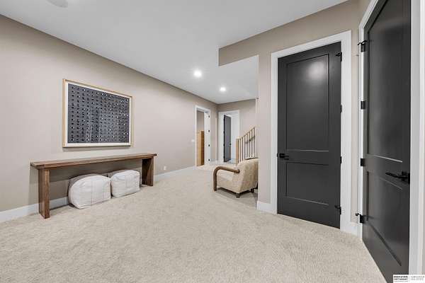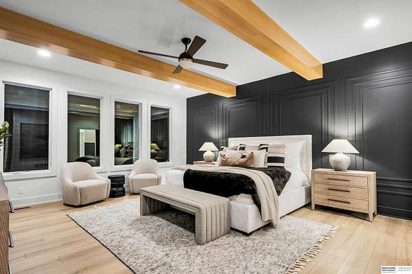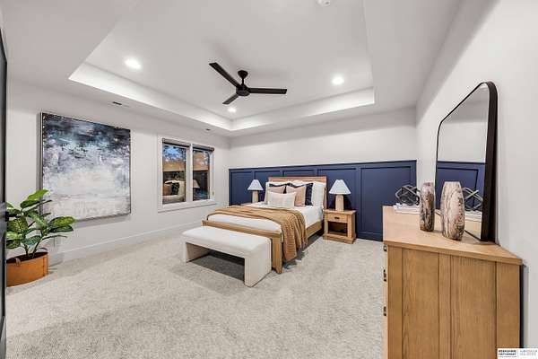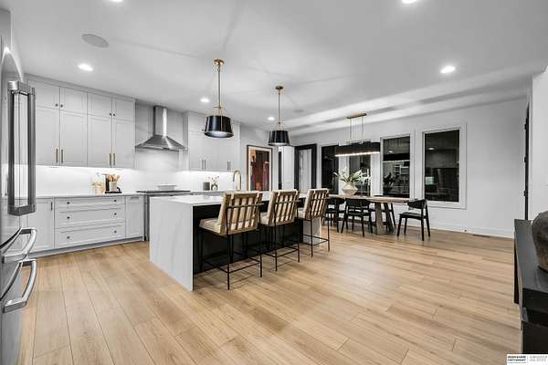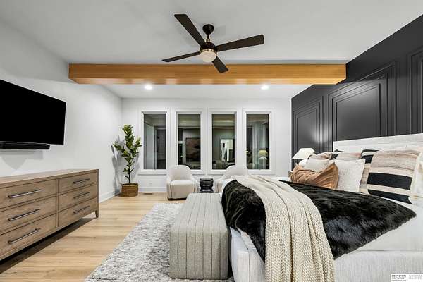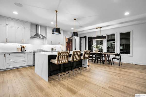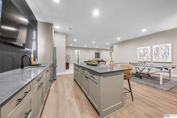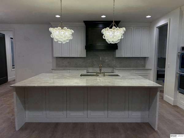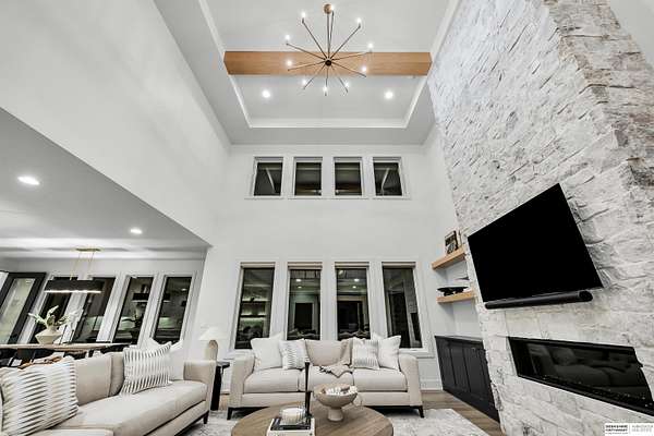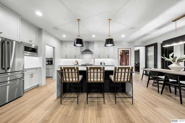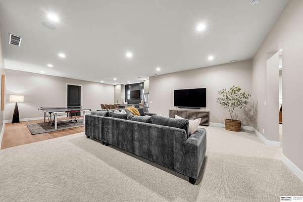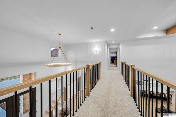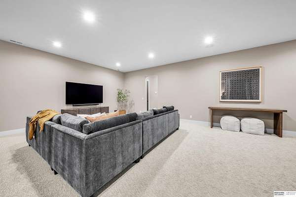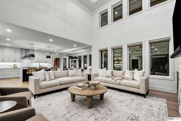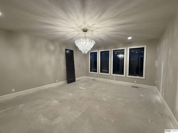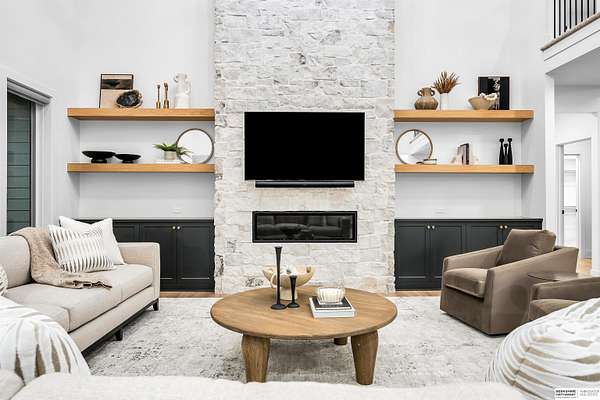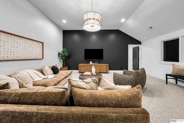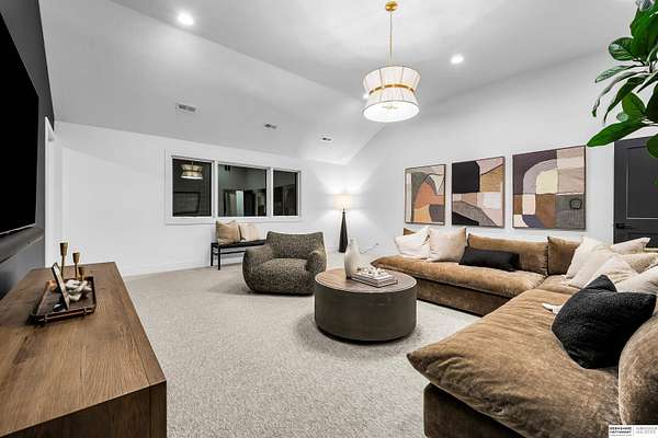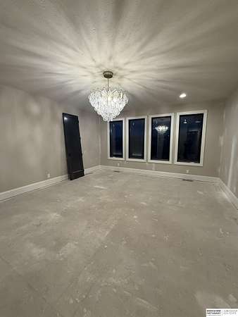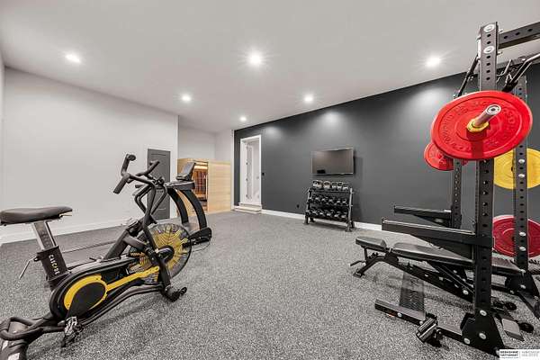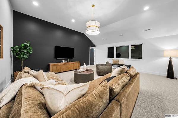 Joe Evans, M: 402-612-7993, joe3evans@gmail.com, https://www.bhhsamb.com - Acreage living awaits in this extraordinary 1.5-story home by iCON Homes, perfectly situated on 1.5 acres in the highly sought-after neighborhood The Estates at Wynnwood. Step inside and be captivated by the circular staircase, open great room with its striking floor-to-ceiling brick fireplace, a chef-inspired gourmet kitchen featuring a stunning waterfall island, and an expansive walk-in pantry. Your private oasis offers panoramic views of lush greenery and mature trees, creating an unparalleled sense of peace and privacy. The main floor boasts a luxurious primary suite with a spa-like bath, including a soaker tub, walk-in shower, and huge custom closet, plus a convenient home office. Upstairs, you'll find three additional bedrooms, two baths, and a spacious bonus room. The lower level is an entertainer's dream--complete with an 11 foot drooped floor gym, full bar, additional bedroom with bath, and a large rec r