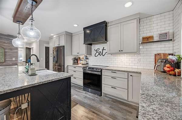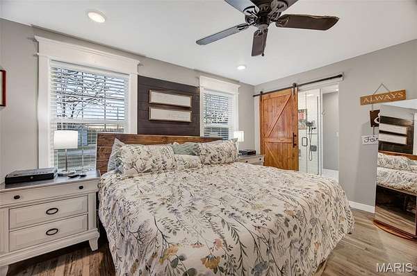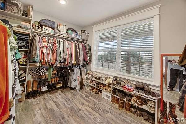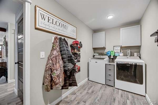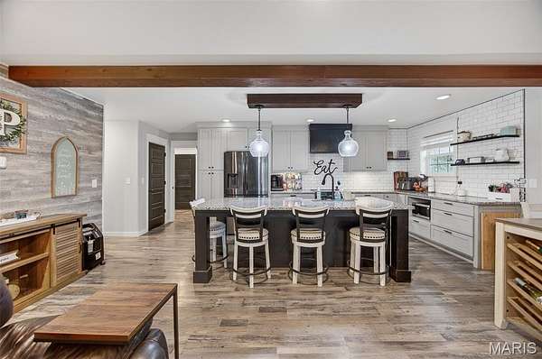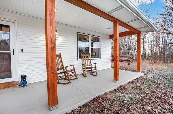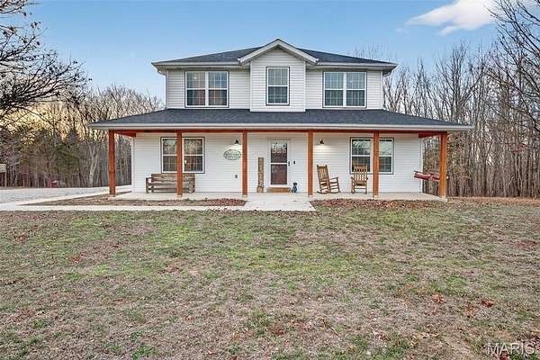 Positioned on 4.3 gently rolling acres in the Waynesville School District and located near the newly constructed Liberty elementary school, this stunning two-story home offers privacy, functionality, and refined craftsmanship in one exceptional setting. A welcoming covered front porch sets the tone, while inside the open-concept layout creates seamless flow between the living, dining, and kitchen spaces. The well-designed kitchen features granite countertops, dramatic counter-to-ceiling tile backsplash, an oversized island with integrated sink and dishwasher, and deep storage drawers that maximize organization and entertaining ease. The main-level primary suite provides a private retreat with a spacious walk-in closet and spa-inspired bath complete with tiled walk-in shower, double vanity, tile flooring, and counter-to-ceiling backsplash detail. A thoughtfully placed laundry and mudroom on the main level adds convenience for acreage living, and crown molding with detailed trim work throughout elevates the overall finish quality.