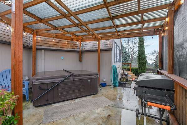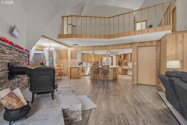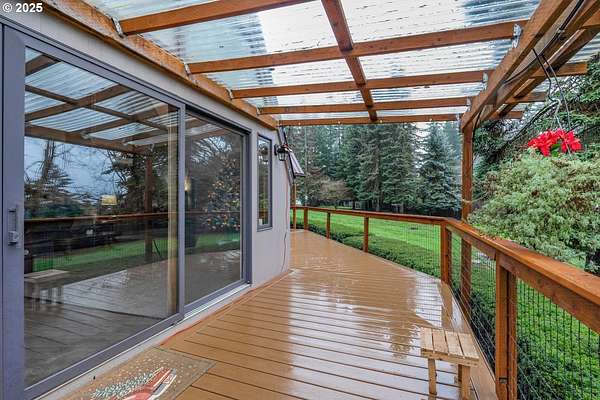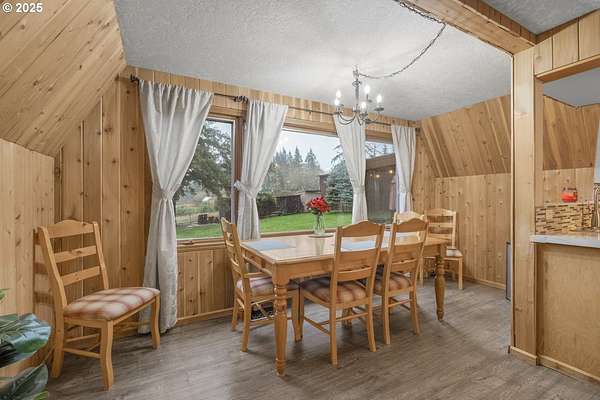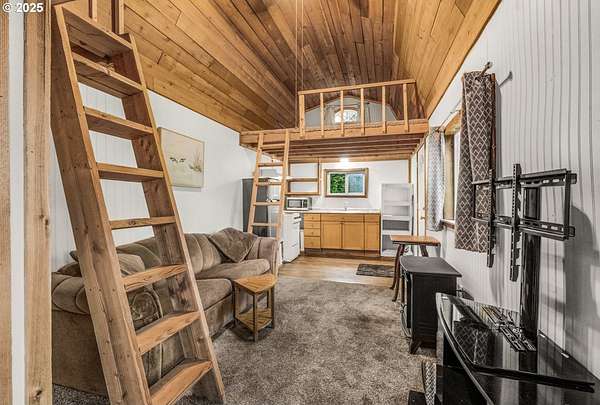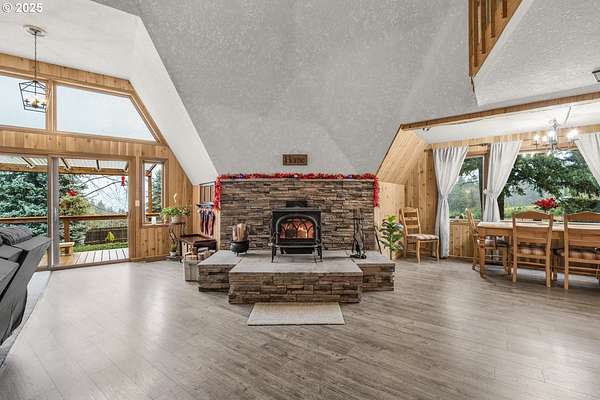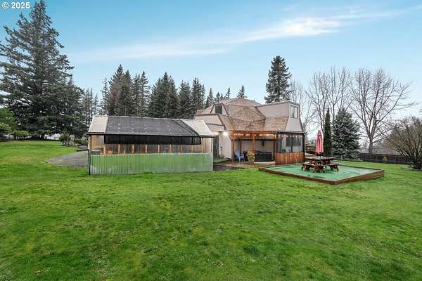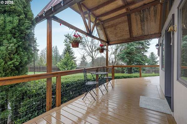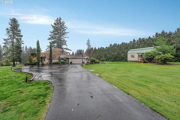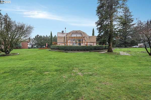 One-of-a-kind dome home on a fenced and gated 1.84-acre setting with mountain vistas is the definition of "unique." Take in sweeping north views of Mt. St. Helens and Mt. Adams, and east views of Mt. Hood. A 270 sq ft movable tiny house with a full kitchen, living room, bathroom and loft bedroom is perfect for guests, multi-generational living, or a creative studio. Inside, the spacious living room has soaring ceilings and sliders to a wraparound deck making it ideal for entertaining. Centered between the living and dining areas, a striking stacked-stone fireplace showcases a certified Lopi wood stove. The kitchen is made for gathering with a large cook island and eat bar, newer stainless appliances and a pantry. The primary suite is on the main level with a walk-in closet and easy access to the bath featuring a relaxing soaking tub. There's also a separate bath with a walk-in shower and a laundry room with a utility sink, built-ins, and direct access to a fantastic enclosed carport, perfect for storage, hobbies, or a hangout space with sliders opening to a covered patio and hot tub. Upstairs you'll find two more bedrooms, a half bath, and a loft area ideal for a media space or reading nook, and an office space complete with built-ins. Recent updates add move-in-ready appeal, including new carpeting, LVP flooring, lighting, interior paint, and detailed woodwork. Outside, enjoy a beautiful, expansive backyard framed by pine trees that create a private, secluded feel. Gardeners will love the private well with dual cisterns for reliable irrigation, plus a water filtration system, new well pump and newer HVAC system for peace of mind. Outbuildings including a 24x36 pole barn, greenhouse, school bus shelter, and wood shed offering space for projects, animals, storage, and more. There's also a large driveway with plenty of room for RV parking. Just minutes to dining, Springwater Golf Course, McIver State Park, and the Clackamas River.