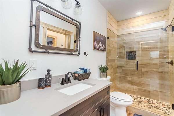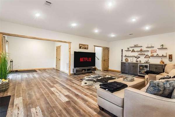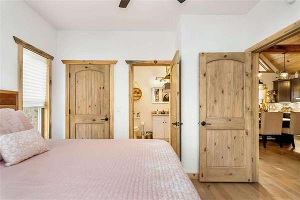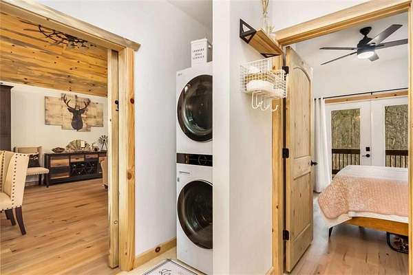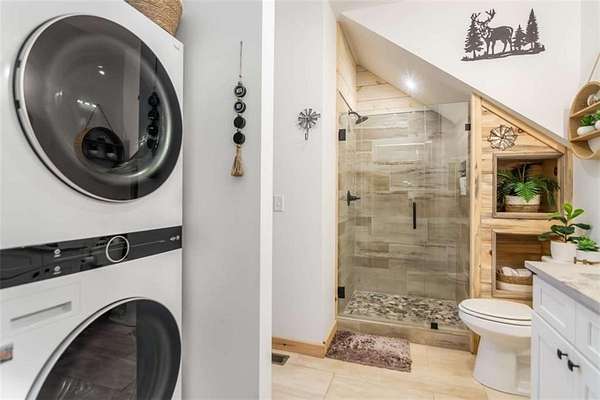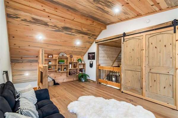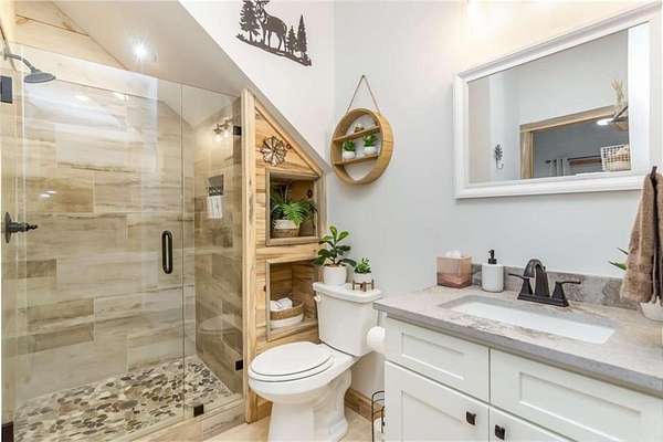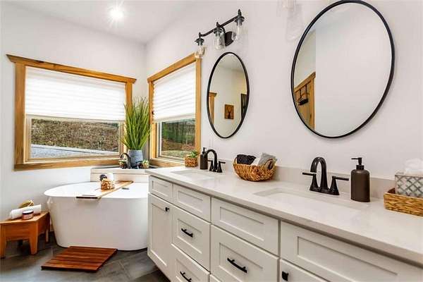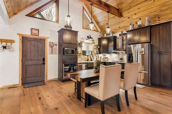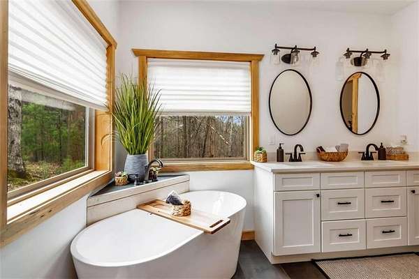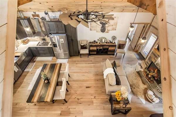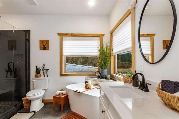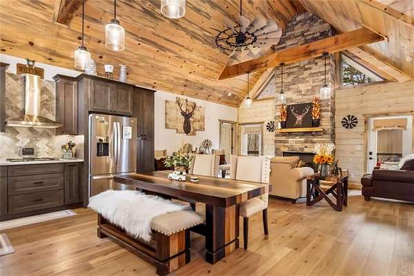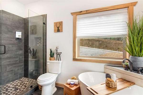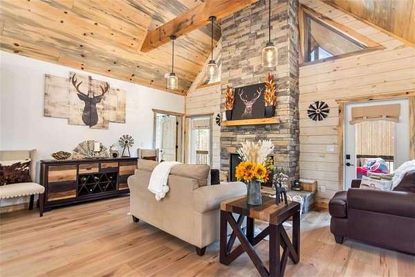 227 Fir Lane - Modern Rustic Dream on 2.54 Acres with Creek & Hot Tub Built in 2022, this stunning modern rustic home offers 2,500 sq ft, 3 bedrooms, 3 full baths, and 2.54 private acres with a creek running the entire back property line and a natural spring-perfect for peace, privacy, and outdoor living. Main Level: Two spacious bedrooms, including two primary suites, both with tiled baths. The open-concept living area features real hardwood floors, wood ceilings, and a gas-log fireplace. The kitchen is a chef's dream with custom wood cabinets, quartz countertops, tile backsplash, stainless steel appliances, gas stove, and wall oven. Second bath includes laundry, tile floors, and tile shower. Upstairs Loft: Hardwood floors and barn door make this space ideal for an office or bonus room. Finished Basement: 10-ft ceilings, LVP flooring, full bar with sink and mini fridge, a bedroom with two closets, and a full bath with tile shower. Lower-level outdoor area includes hot tub, seating, TV, and a two-person gas firepit, all overlooking the peaceful creek. Outdoor Living: Expansive covered decks on both levels, including a back porch with stacked-stone gas-log fireplace. Perfect for entertaining or relaxing while listening to the creek. Additional Features: Built in 2022 with roof, HVAC, hot water heater, cedar shake accents, Hardi-board siding, expanded parking, cement side stairs, leaf-filter gutters, and pest protection. Sold furnished and turn-key (excluding personal items). Location Perks: Just 1 mile from Newport River access and pool, where you can float and enjoy riverfront fun. This home is a rare combination of luxury, modern rustic charm, and nature's serenity-perfect for buyers looking for a move-in ready, turnkey escape.