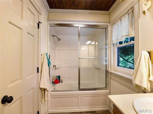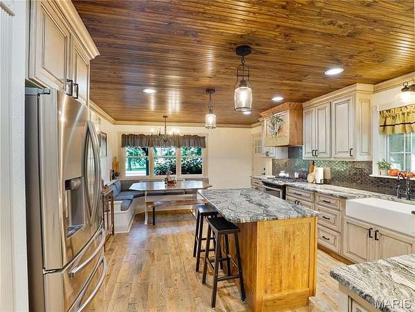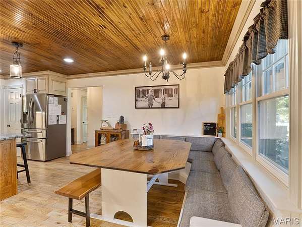 The home boasts custom cabinetry with a large dine-in kitchen complete with built-in seating, a sunroom, and a screened-in porch ideal for quiet mornings or evening relaxation. Step outside into a large outdoor entertainment space perfect for gatherings, complete with an inground pool surrounded by mature landscaping and beautiful views.