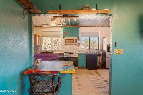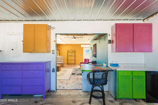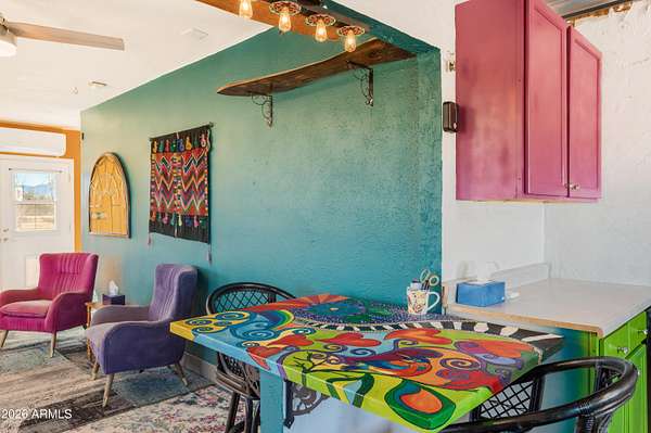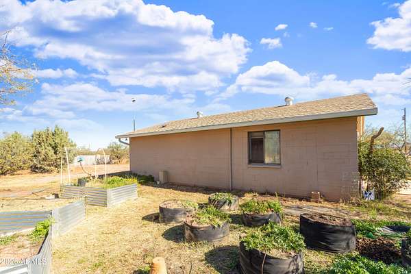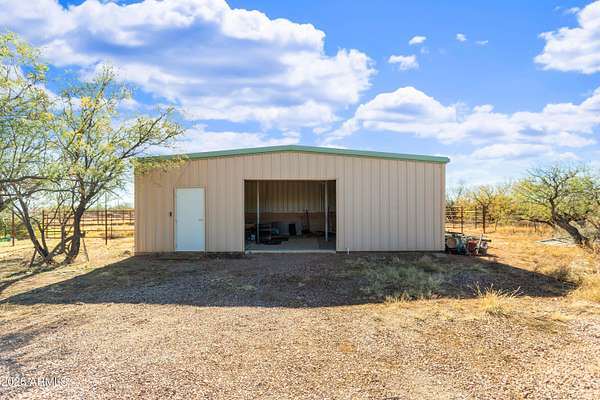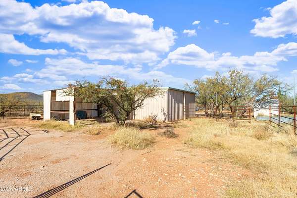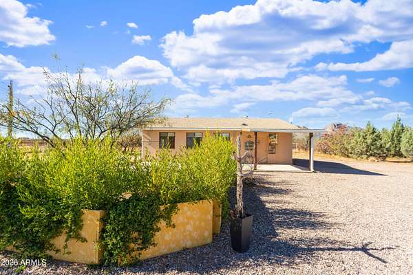 Enjoy sweeping views of the Whetstone and Huachuca Mountains from this ideally located 16-acre property near Sonoita's wine country, Tombstone, and Sierra Vista. The home sits on four conjoining lots with commercial/residential zoning along a county-maintained paved road. Built of durable split-block construction, this former oversized garage was converted in 2024 with warm Southwest style. A covered porch opens to a shaded courtyard with drip-irrigated native plants. Features include an open floor plan, laundry room, oversized bedroom, large closet, four-bedroom septic (2022), 30'x36' shop, fenced acreage, corrals, animal shelter, automatic livestock waterer, solar water panels, garden beds, sheds, privacy, and room to expand.