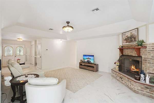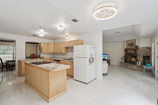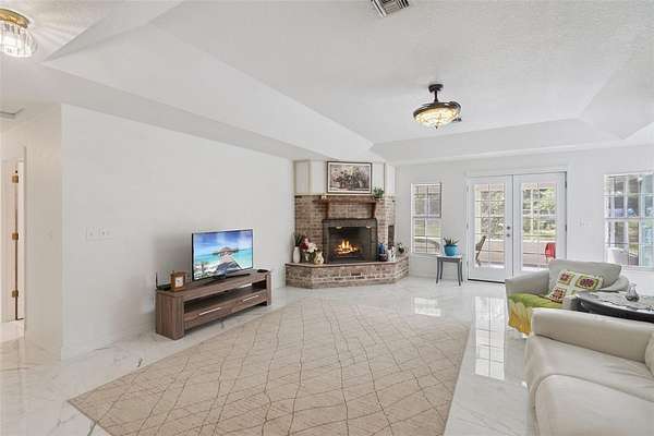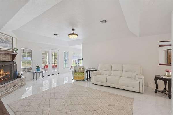 A welcoming double-door entry opens to a spacious interior featuring a formal dining room and a large living room centered around a cozy wood-burning fireplace. Brand-new French doors lead to a beautifully enclosed patio with newly tiled flooring, creating the perfect extension of indoor and outdoor living space. The home also features stylish no-carpet flooring throughout and a spacious kitchen with classic wood cabinetry, a center cooking island, and a charming breakfast nook overlooking the serene backyard setting.
