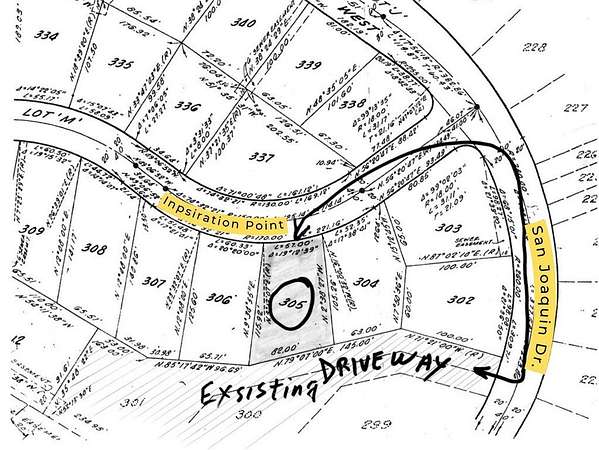 Builable lot with spectacular view of the hills and mountains. Prime location with a great price! This lot is lcoated with the back side to Inpsiration Point (where address is) and the front side is on San Joaquin Dr West. Access this lot around the corner on San Joaquin Dr West, just follow the red arrow up the wide driveway. This driveway is shared by five other houses. The lot is surrounded by water front homes with miliion dollar price tags. It's a quiet street with all utilites available for your build. Lot is situated between two houses that would have a similar size and structure. Build your own custom home here with no mello roos and a low tax rate. Enjoy the Canyon Lake resort life in a community that beckons famlies of all kinds to relax and lie like you're on vacation every day. This city has it all! From a state of the art club house and pool, to beaches, parks, equestrian center, baseball diamonds, volleyball/ pickleball/ tennis courts, dog park, and senior center. Enjoy the year-round community events such as the annual Easter Egg festival, Fiesta days on Memorial weekend, the 4rth of July parade, Halloween festival, Veteran's day celebrations, and the Tree Lighting ceremony at the lodge. Come be a part of one of the valleys true hidden gems! Lot size is approx. 57 feet on Inspiration, 105 ft on east side, 115 ft on west side, and 82 ft on top of hill by driveway access road.