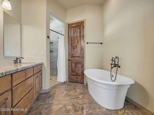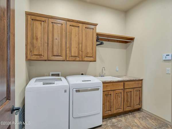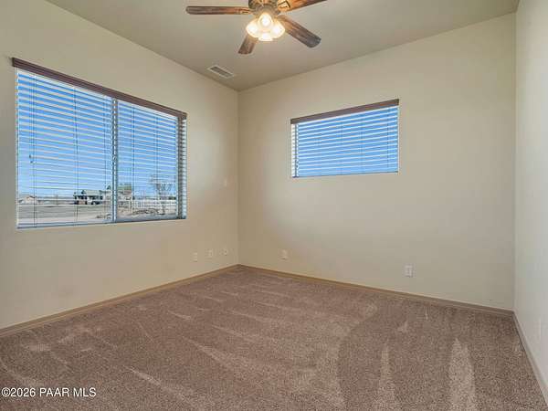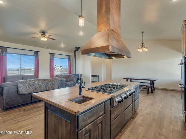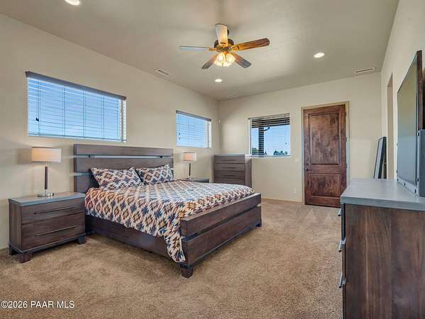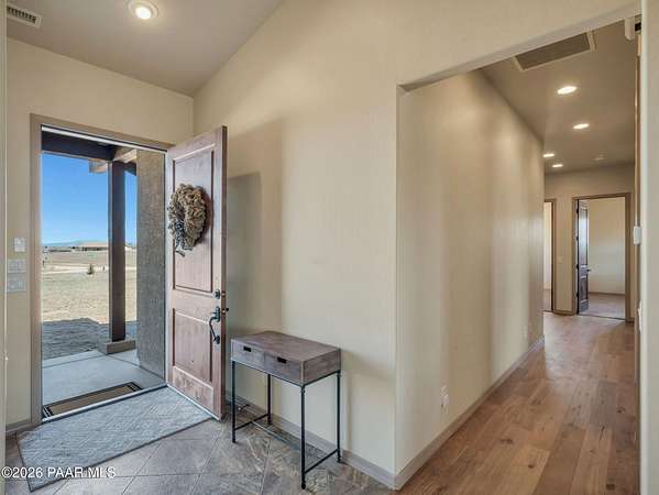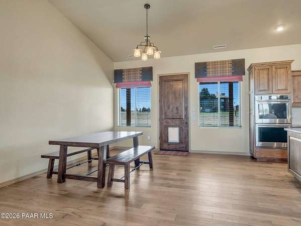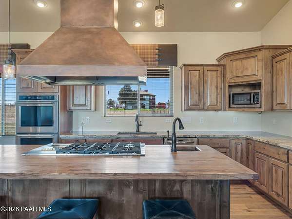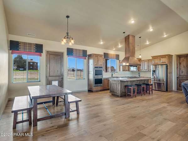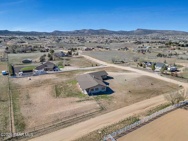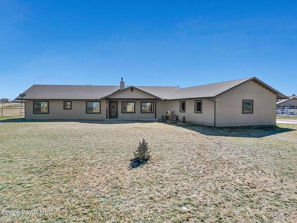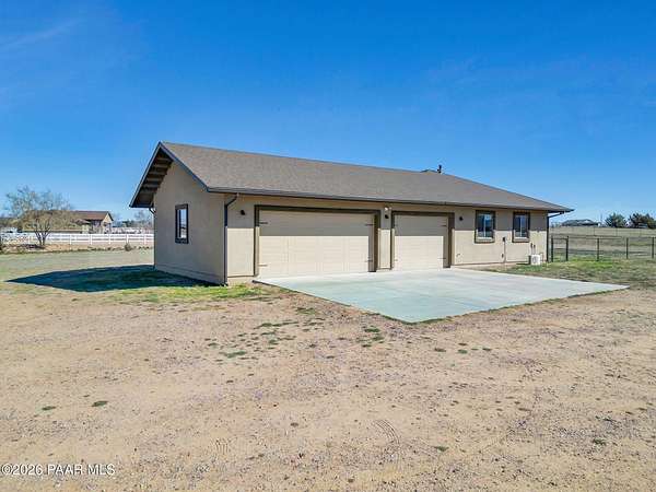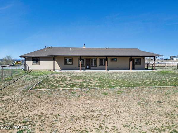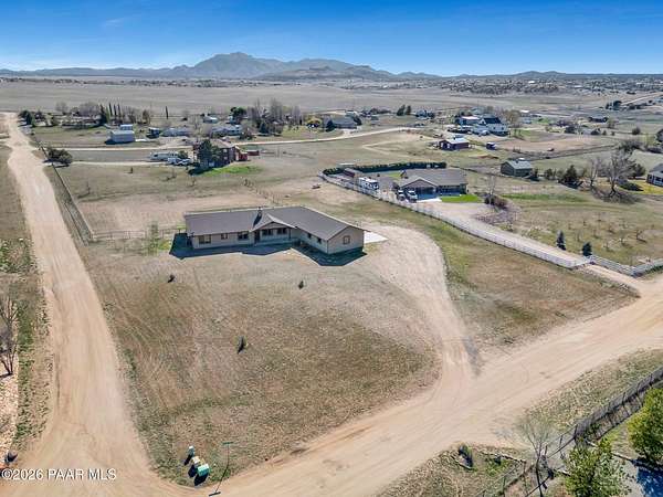 Situated on just over 2 acres with beautiful views of Granite Mountain, this custom Chino Valley home showcases quality craftsmanship and thoughtful upgrades throughout. Offering 4 bedrooms and 3 bathrooms, the home combines spacious living with high-end finishes in a peaceful rural setting.Inside, the open and inviting floor plan features vaulted ceilings, gorgeous wood flooring, and 8' solid knotty alder doors that add warmth and character throughout the home. The well-appointed kitchen is designed for both everyday living and entertaining, featuring granite countertops, custom cabinetry, KitchenAid stainless steel appliances, double wall ovens, a large walk-in pantry, custom copper vent hood, and an oversized island with gas cooktop.The kitchen flows seamlessly into the great room, which offers direct access to the expansive covered back patio, creating the perfect indoor-outdoor living space for gatherings or simply enjoying the surrounding views.The spacious owner's suite also enjoys patio access and includes a spa-like bathroom complete with dual vanities, soaking tub, walk-in shower, and a large walk-in closet.Bedrooms two and three share a full bathroom, while bedroom four--also ideal as a home office--is located adjacent to a half bath, providing flexibility for guests or workspace needs.Additional highlights include a mudroom/laundry room with washer and dryer included, a central vacuum system, and upgraded spray-in foam insulation throughout, helping provide excellent energy efficiency.The property features a good-producing private well equipped with a modern VFD pump system. Car enthusiasts, hobbyists, or those needing extra workspace will appreciate the oversized extra-deep 3-car garage with a large heated workshop.The partially fenced backyard with gates provides space for pets, projects, or outdoor enjoyment, while the 2+ acre parcel offers plenty of room to add horse facilities, RV parking, or additional toys.This thoughtfully designed home combines quality construction, modern comfort, and wide-open Arizona living--on over 2 acres with scenic Granite Mountain views.